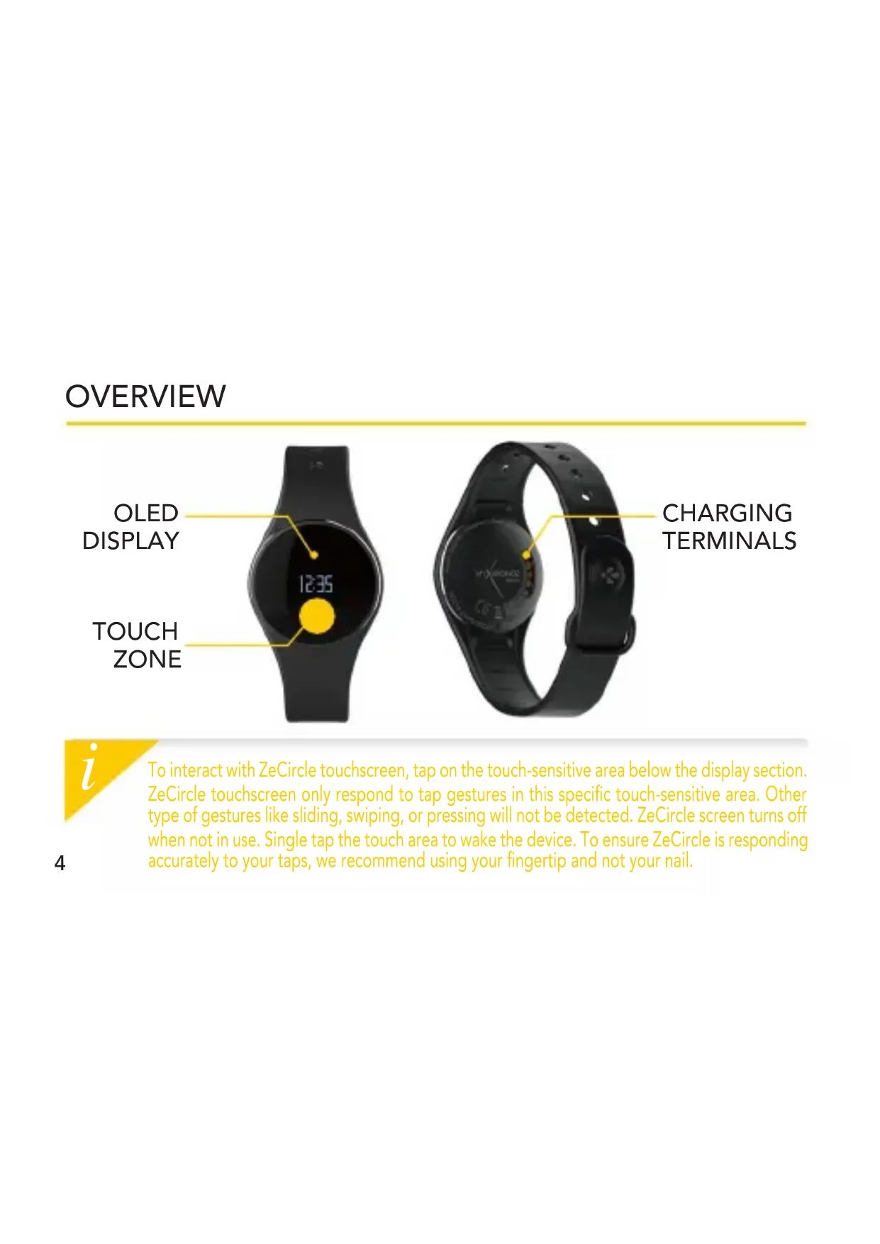 To interact with ZeCircle touchscreen, tap on the touch-sensitive area below the display section. ZeCircle touchscreen only respond to tap gestures in this specific touch-sensitive area. Other type of gestures like sliding, swiping, or pressing will not be detected. ZeCircle screen turns off when not in use. Single tap the touch area to wake the device. To ensure ZeCircle is responding accurately to your taps, we recommend using your fingertip and not your nail.