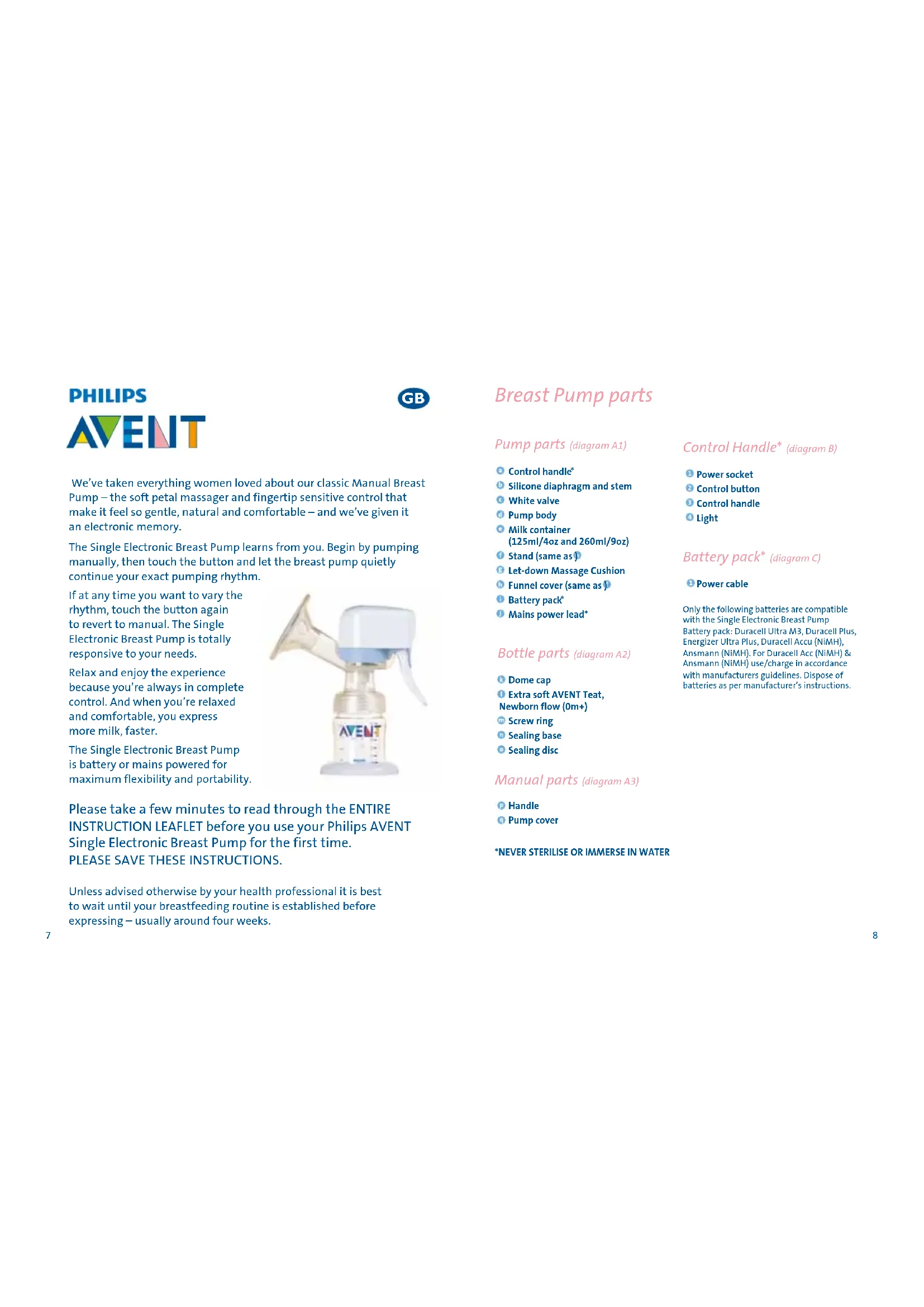 1We’ve taken everything women loved about our classic Manual Breast Pump – the soft petal massager and fingertip sensitive control that make it feel so gentle, natural and comfortable – and we’ve given it an electronic memory.The Single Electronic Breast Pump learns from you. Begin by pumping manually, then touch the button and let the breast pump quietly continue your exact pumping rhythm.If at any time you want to vary the rhythm, touch the button again to revert to manual. The Single Electronic Breast Pump is totally responsive to your needs.Relax and enjoy the experience because you’re always in complete control. And when you’re relaxed and comfortable, you express more milk, faster.The Single Electronic Breast Pump is battery or mains powered for maximum flexibility and portability. Please take a few minutes to read through the ENTIRE INSTRUCTION LEAFLET before you use your Philips AVENT Single Electronic Breast Pump for the first time. PLEASE SAVE THESE INSTRUCTIONS. Unless advised otherwise by your health professional it is best to wait until your breastfeeding routine is established before expressing – usually around four weeks. Pump parts (diagram A1) Breast Pump parts Dome cap Extra soft AVENT Teat, Newborn flow (0m+) Screw ring Sealing base Sealing disc Control handle Silicone diaphragm and stem White valve Pump body Milk container (125ml/4oz and 260ml/9oz) Stand (same as ) Let-down Massage Cushion Funnel cover (same as ) Battery pack Mains power lead* Control Handle* (diagram B) Power socket Control button Control handle Light Battery pack* (diagram C) Power cable Bottle parts (diagram A2) Only the following batteries are compatible with the Single Electronic Breast Pump Battery pack: Duracell Ultra M3, Duracell Plus, Energizer Ultra Plus, Duracell Accu (NiMH), Ansmann (NiMH). For Duracell Acc (NiMH) & Ansmann (NiMH) use/charge in accordance with manufacturers guidelines. Dispose of batteries as per manufacturer’s instructions. Manual parts (diagram A3) Handle Pump cover*NEVER STERILISE OR IMMERSE IN WATER
