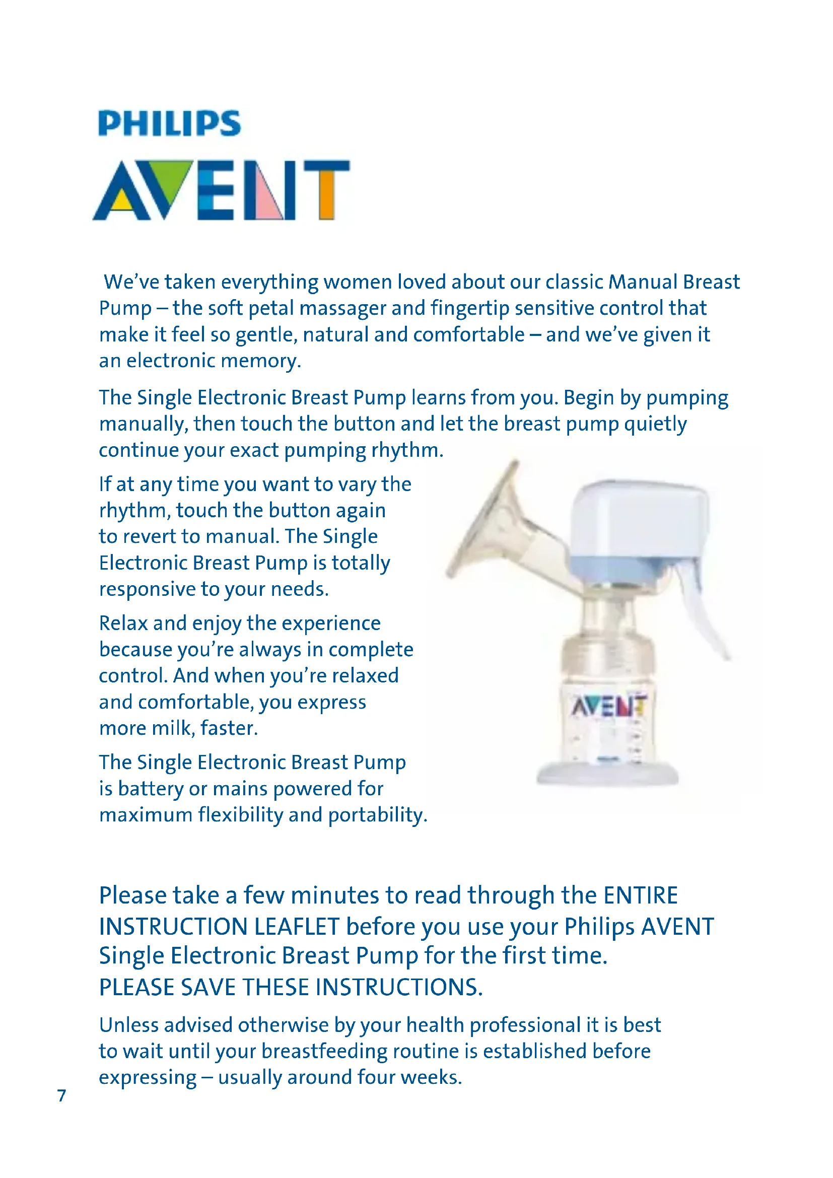 6We’ve taken everything women loved about our classic Manual Breast Pump – the soft petal massager and fingertip sensitive control that make it feel so gentle, natural and comfortable – and we’ve given it an electronic memory. The Single Electronic Breast Pump learns from you. Begin by pumping manually, then touch the button and let the breast pump quietly continue your exact pumping rhythm. If at any time you want to vary the rhythm, touch the button again to revert to manual. The Single Electronic Breast Pump is totally responsive to your needs. Relax and enjoy the experience because you’re always in complete control. And when you’re relaxed and comfortable, you express more milk, faster. The Single Electronic Breast Pump is battery or mains powered for maximum flexibility and portability. Please take a few minutes to read through the ENTIRE INSTRUCTION LEAFLET before you use your Philips AVENT Single Electronic Breast Pump for the first time. PLEASE SAVE THESE INSTRUCTIONS. Unless advised otherwise by your health professional it is best to wait until your breastfeeding routine is established before expressing – usually around four weeks. 7Pump parts (diagram A1) Breast Pump parts Dome cap Extra soft AVENT Teat, Newborn flow (0m+) Screw ring Sealing base Sealing disc Control handle