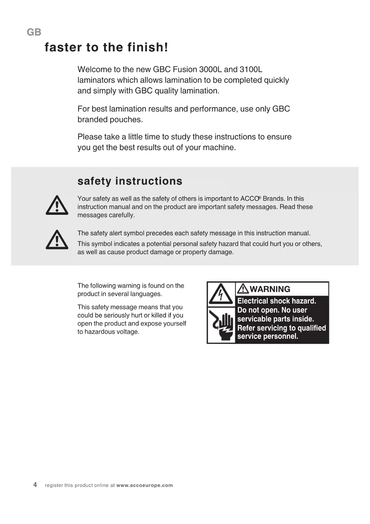 4 register this product online at www.accoeurope.com faster to the finish! Welcome to the new GBC Fusion 3000L and 3100L laminators which allows lamination to be completed quickly and simply with GBC quality lamination.For best lamination results and performance, use only GBC branded pouches.Please take a little time to study these instructions to ensure you get the best results out of your machine. Electrical shock hazard. Do not open. No user servicable parts inside. Refer servicing to qualied service personnel.WARNING