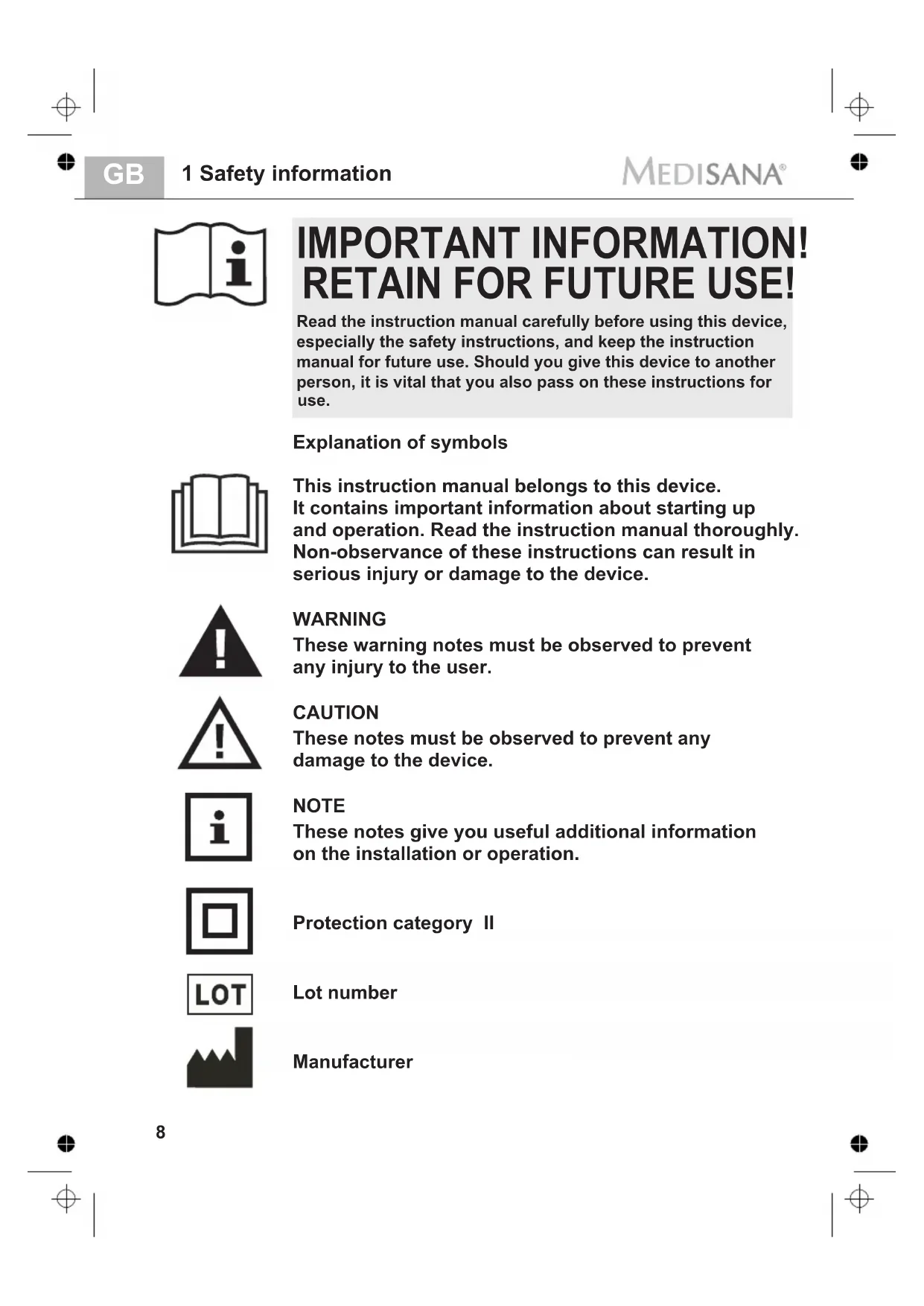 - If the power supply cable is damaged, it may only be replaced by MEDISANA, an authorised dealer or by qualified personnel.