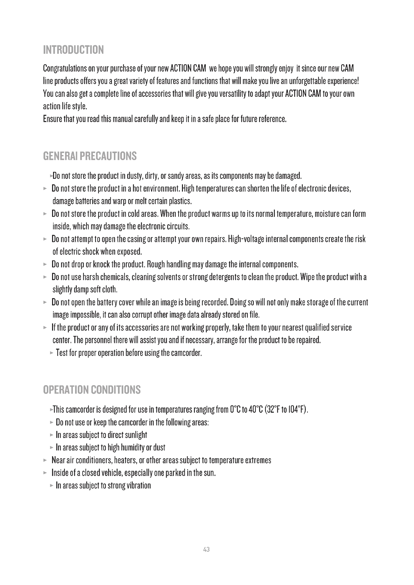 Be sure to come ashore within 60 minutes after going underwater, this will maintain the appearance, quality and water resistance of the waterproof case. ≥ After removing the camcorder from the waterproof case, soak the waterproof case in a bucket of clean water for about 10 minutes. Do not use any soapy water, mild detergents, alcohol or similar liquids to clean the case. Wipe the waterproof case dry with a lint-free cloth. Place the waterproof case in a well ventilated cool place to dry naturally (do not place under direct sunlight). ≥ The material should be replaced once a year to maintain its water resistance. ≥ If water accidentally enters the camcorder or any problem occurs when it is in water, please get it out of the water immediately and take proper actions. Dry the camcorder and send it for repair, if required SYSTEm REQUIREmENTS The camcorder requires a PC with the following specifications for full HD 1080p 30fps and 720p 60fps playback: ≥ SO, Windows® or Mac OS X® ≥ Intel® / AMD Dual-Core CPU or higher ≥ At least 1 GB of RAM or higher ≥ Video Card DirectX 9 (DirectX II is recommended) ≥ Standard USB 1.1 port or higher ≥ At least 2GB or greater available hard disk space Note: A USB 1.1 port will enable you to transfer files to and from your host PC, but transfer speeds will be faster with a USB 2.0 port.4746 fEATURES Sport video camera FULL HD 1080p (30fps) and wide angle, with CMOS 1/ 2.5” sensor for photos up to 5MPx JPEG format, auto exposure setting and fixed len f2.8. Built-in Mic and additional input. High contrast backlight OLED display. Professional functions (single shot, time lapse, timer, burst). Waterproof case IPX8 60m. Rechargeable Li-Ion battery. USB 2.0. HDMI v.1.3. SD/SDHC socket (up to 32GB recommended class 6 or more). Built-in 128 MB Flash memory UNPACkING THE CAmCORDER The following items should be present in the package. If any item is missing or appears damaged, contact your dealer immediately. Camcorder Li-ion Battery User Manual CD-ROM Micro USB Cable Anti-fog Inserts Waterproof Case Waterproof Housing Backdoor RF Wrist Strap Remote Control *** optional for ESC Extreme *** included in ESC Pro47 (2) T Tip Adapter Vented Housing Backdoor Flat Adhesive Socket Curved Adhesive Socket Swivel T Tip T Tip Mount (compatible with GoPro mounts) Bike Mount Standard Tripod Lens Cap Velcro Strap Secure Tether4948 CAmCORDER vIEWS bUTTON fUNCTIONS Power / Mode Button ≥ Press and hold for 3 seconds to turn the camcorder on or off. ≥ Press to switch to different modes: Video, Photo, , Burst, Time Lapse, Self-timer, and Set mode. ≥ Mode WiFi just for model ESC Pro ≥ In Set mode, press to scroll through menu items. Shutter Button ≥ In Video mode, press to start/stop video recording. ≥ In Photo mode, press to take a photo. ≥ In Set mode, press to select an item.49 lED INDICATORS LED Color Description Power / Status LED Green slow blinking Power is on Green Blinking rapidly Mode WiFi is activated. Just for model ESC Pro Red Blinking Video recording in progress Red Blinking Rapidly Self-timer Battery LED Red Blinking Battery is charging Off Full charge5150 GETTING STARTED A micro SD card is required to capture photos and videos. The camcorder supports micro SDHC cards up to 32GB.