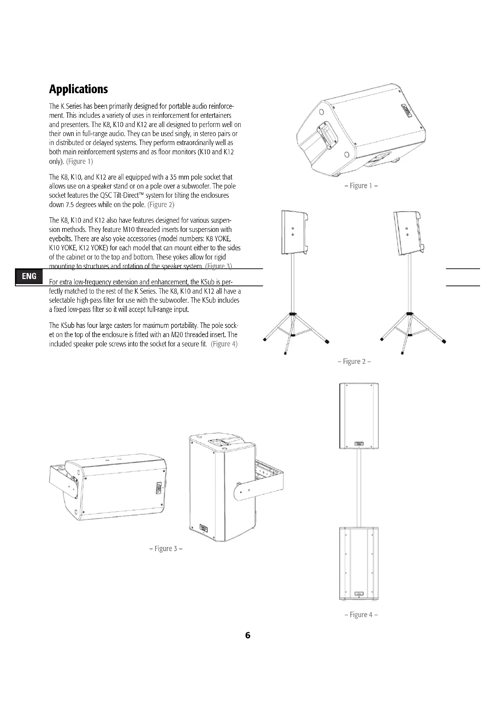 ENG ENG Applications The K Series has been primarily designed for portable audio reinforce- ment. This includes a variety of uses in reinforcement for entertainers and presenters. The K8, K10 and K12 are all designed to perform well on their own in full-range audio. They can be used singly, in stereo pairs or in distributed or delayed systems. They perform extraordinarily well as both main reinforcement systems and as floor monitors (K10 and K12 only). (Figure 1) The K8, K10, and K12 are all equipped with a 35 mm pole socket that allows use on a speaker stand or on a pole over a subwoofer. The pole socket features the QSC Tilt-Direct™ system for tilting the enclosures down 7.5 degrees while on the pole. (Figure 2) The K8, K10 and K12 also have features designed for various suspen- sion methods. They feature M10 threaded inserts for suspension with eyebolts. There are also yoke accessories (model numbers: K8 YOKE, K10 YOKE, K12 YOKE) for each model that can mount either to the sides of the cabinet or to the top and bottom. These yokes allow for rigid mounting to structures and rotation of the speaker system. (Figure 3) For extra low-frequency extension and enhancement, the KSub is per- fectly matched to the rest of the K Series. The K8, K10 and K12 all have a selectable high-pass filter for use with the subwoofer. The KSub includes a fixed low-pass filter so it will accept full-range input. The KSub has four large casters for maximum portability. The pole sock- et on the top of the enclosure is fitted with an M20 threaded insert. The included speaker pole screws into the socket for a secure fit. (Figure 4) – Figure 1 – – Figure 2 – – Figure 3 – – Figure 4 –6 ENG ENG