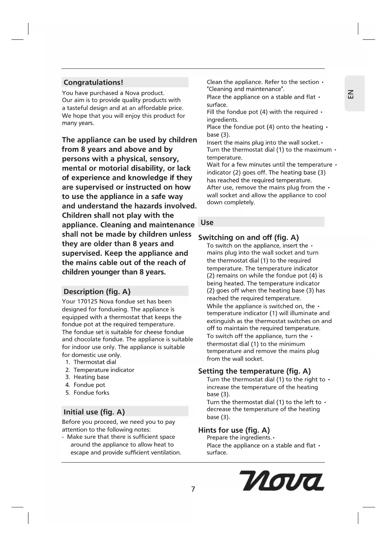 Congratulations! You have purchased a Nova product. Our aim is to provide quality products with a tasteful design and at an affordable price. We hope that you will enjoy this product for many years. The appliance can be used by children from 8 years and above and by persons with a physical, sensory, mental or motorial disability, or lack of experience and knowledge if they are supervised or instructed on how to use the appliance in a safe way and understand the hazards involved. Children shall not play with the appliance. Cleaning and maintenance shall not be made by children unless they are older than 8 years and supervised. Keep the appliance and the mains cable out of the reach of children younger than 8 years. Description (fig. A) Your 170125 Nova fondue set has been designed for fondueing. The appliance is equipped with a thermostat that keeps the fondue pot at the required temperature. The fondue set is suitable for cheese fondue and chocolate fondue. The appliance is suitable for indoor use only. The appliance is suitable for domestic use only.