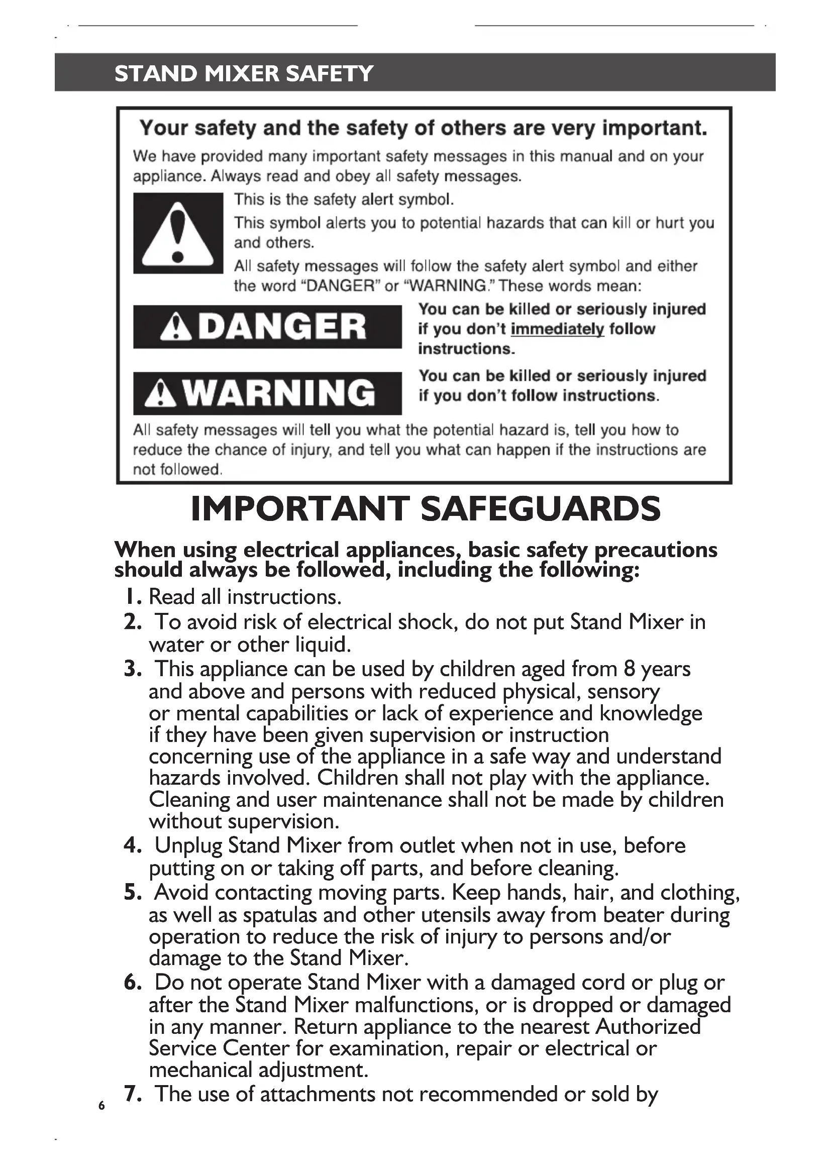 6. Do not operate Stand Mixer with a damaged cord or plug or