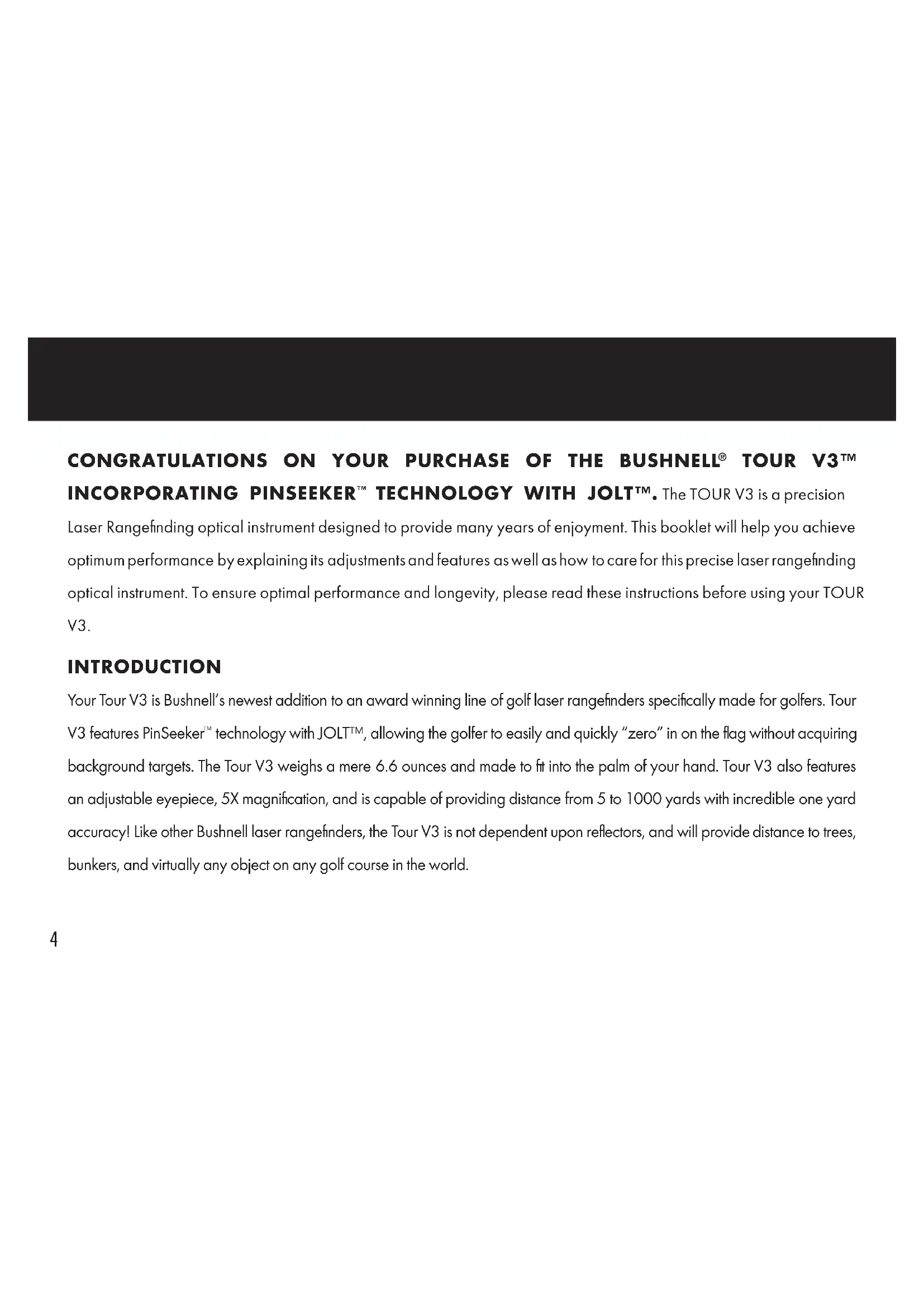 TECHNOLOGY WITH JOLT™. The TOUR V3 is a precision Laser Rangefinding optical instrument designed to provide many years of enjoyment. This booklet will help you achieve optimum performance by explaining its adjustments and features as well as how to care for this precise laser rangefinding optical instrument. To ensure optimal performance and longevity, please read these instructions before using your TOUR V3. INTRODUCTION Your Tour V3 is Bushnell’s newest addition to an award winning line of golf laser rangefinders specifically made for golfers. Tour V3 features PinSeeker