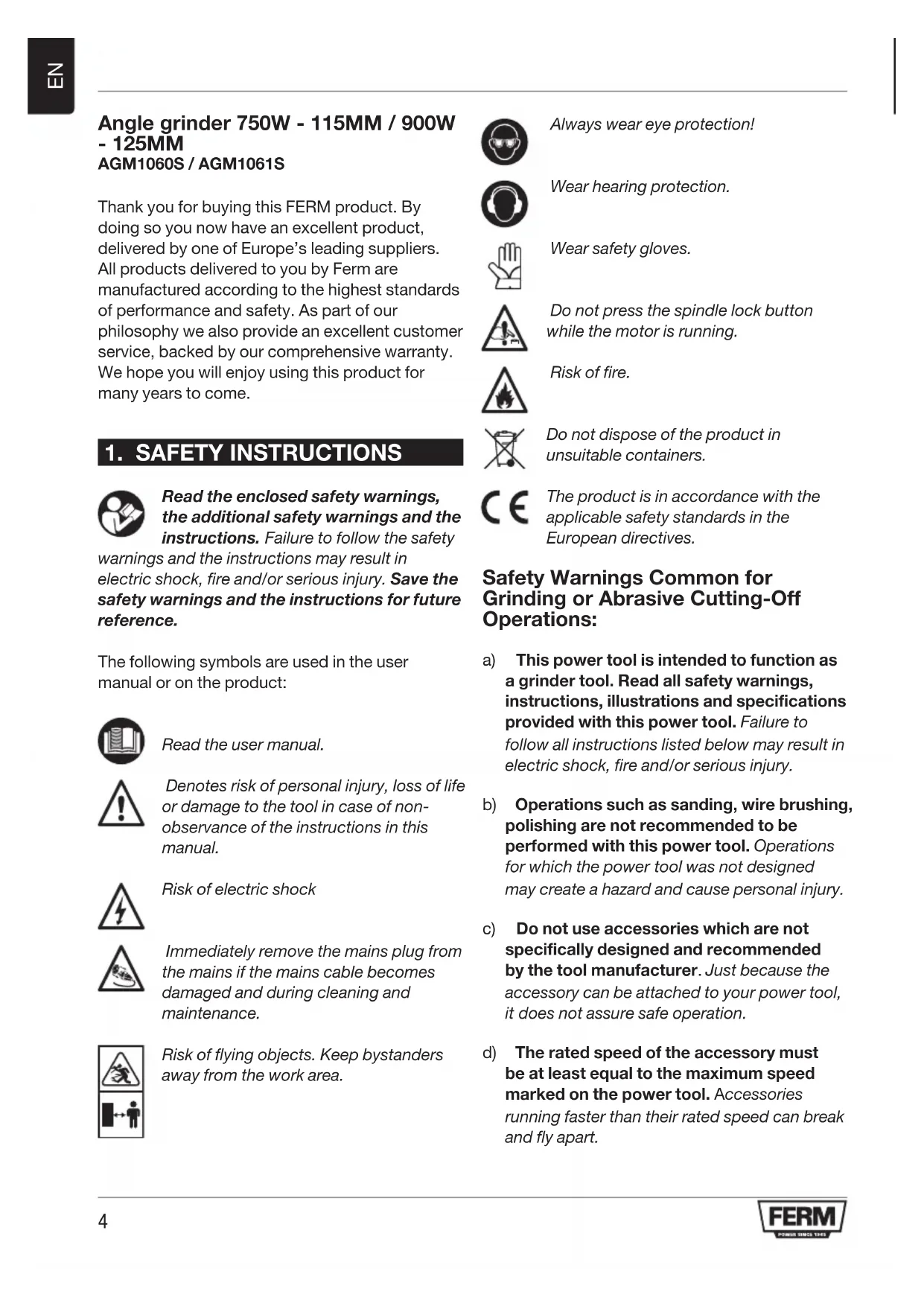 Download the instructions for your Grinder in PDF format for free! Find your manual AGM1061S - Ferm and take your electronic device back in hand. On this page are published all the documents necessary for the use of your device. AGM1061S by Ferm.