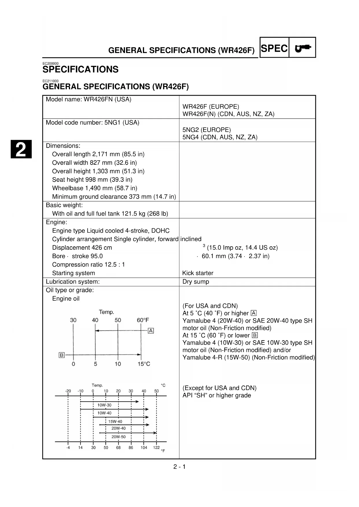 - For AUS and NZ (WR426F) Part name Size Part number Drive sprocket 1 (STD) 14T *15T 9383E-14215 9383E-15082 Driven sprocket 2 (STD) 48T 50T 52T 5GS-25448-50 5GS-25450-50 5GS-25452-50 EC721002 Tire pressure Tire pressure should be adjust to suit the road surface condition of the circuit. ● Under a rainy, muddy, sandy, or slippery condition, the tire pressure should be lower for a larger area of contact with the road sur- face. ● Under a stony or hard road condition, the tire pressure should be higher to prevent a flat tire. Standard tire pressure: 100 kPa (1.0 kg/cm