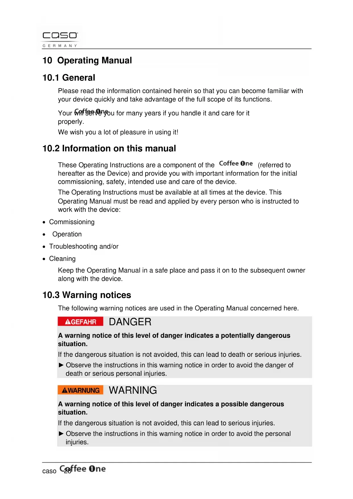 Please note Please observe the following general safety notices with regard to the safe handling of the device. ► Read all these instructions before using the appliance. ► This appliance is not intended for the use by persons (including children) with restricted physical, sensory or mental capacities or those with insufficient experience or skills unless they are being supervised or have been instructed by a person responsible for their safety. ► Examine the device for any visible external damages prior to using it. Never put a damaged device into operation. ► If the connection lead is damaged, you will need to have a new connection lead installed by an authorized electrician. ► Do not permit children to use the appliance without supervision. ► Do not leave the device unsupervised when it is in operation. ► Do not operate the if it is empty. This could damage the device.caso 31 Please note ► Use the device exclusively for cooking coffee. Do not enter any other liquids (than water) or foods in the device. ► Unplug your appliance as soon as you stop using it or to clean it. ► All operations other than cleaning and usual maintenance must be performed by an approved service centre. ► Do not leave the power cord hanging within children's reach. ► The power cord must never be near or in contact with the hot parts of the machine, near a source of heat or over a sharp edge. ► For your own safety, only use manufacturer accessories and spare parts suited to your machine. ► Do not disconnect the plug from the socket by pulling on the cord. ► Do not use the coffeepot on an open flame or on electric cooker plates. ► Do not add water in the appliance if it is still hot. ► Always keep the lid closed when the coffee maker is operating. ► All our machines undergo strict quality control. Hands-on tests are carried out on machines at random, which accounts for any traces of use. ► Never use the coffeepot without the lid. ► Only qualified electricians, who have been trained by the manufacturer, may carry out any repairs that may be needed. Improperly performed repairs can cause considerable dangers for the user. ► Only customer service departments authorized by the manufacturer may carry out repairs on the device during the guarantee period, as otherwise the guarantee entitlements will be null and void in the event of any subsequent damages. ► Defective components must always be replaced with original replacement parts. Only such parts will guarantee that the safety requirements are fulfilled. ► This appliance can be used by children aged from 8 years and above and persons with reduced physical, sensory or mental capabilities or lack of experience and knowledge if they have been given supervision or instruction concerning use of the appliance in a safe way and understand the hazards involved. ► Children shall not play with the appliance. ► Cleaning and user maintenance shall not be made by children unless they are older than 8 and supervised. ► Keep the appliance and its power cable out of reach of children under the age of 8 years. ► Appliance can be used by persons with reduced physical, sensory or mental capabilities or lack of experience and knowledge if they have been given supervision or instruction concerning use of the appliance in a safe way and understand the hazards involved.caso 32 Please note ► If the supply cord is damaged, it must be replaced by the manufacturer, its service agent or similarly qualified persons in order to avoid a hazard. ► This appliance is intended for use in households and similar applications as listed below: ► - staff kitchens areas in shops, offices and other working environments, ► - by clients in hotels, motels and similar residential type environments; ► - farm houses; ► - bed and breakfast type environments