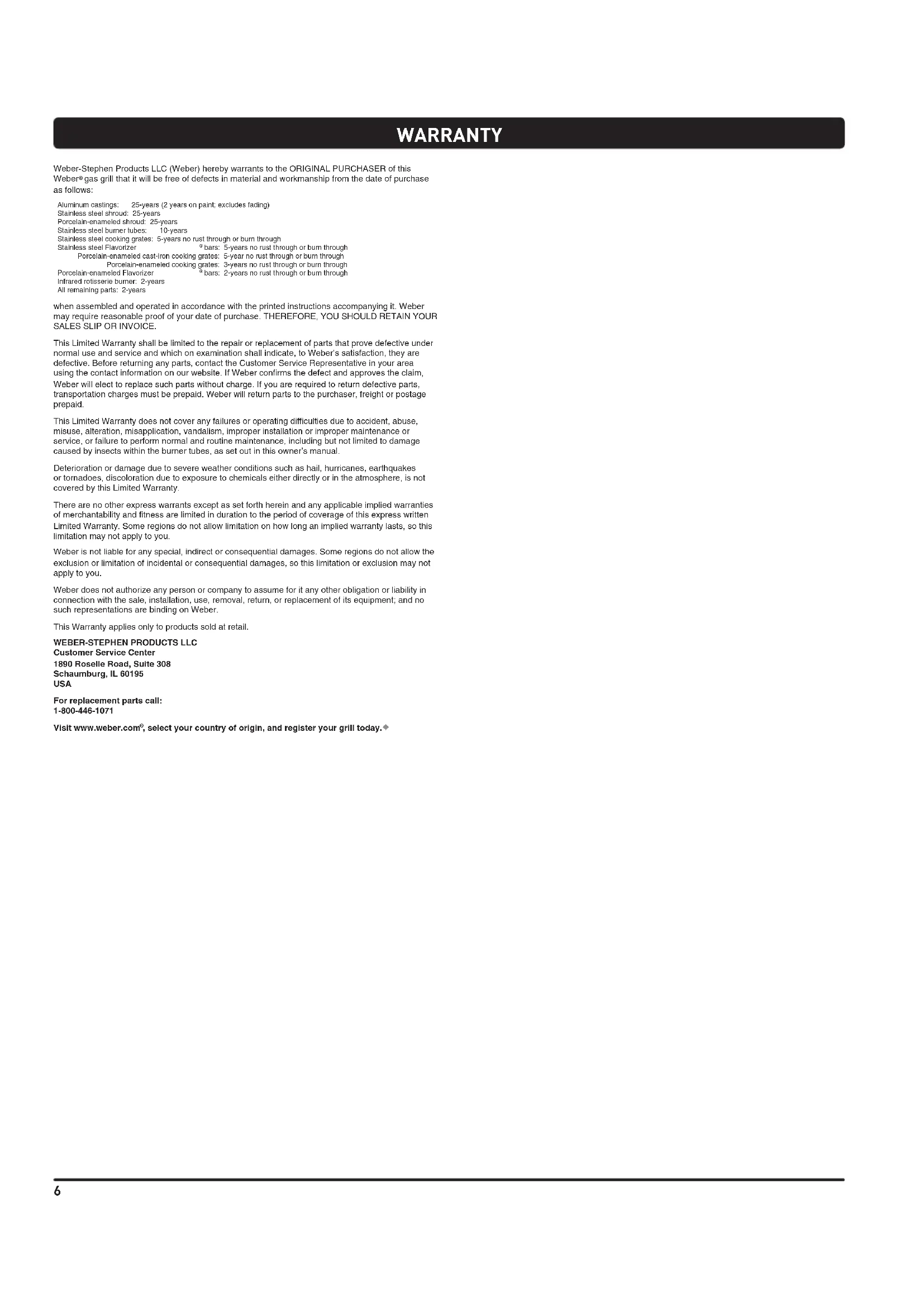 bars: 2-years no rust through or burn through Infrared rotisserie burner: 2-years All remaining parts: 2-years when assembled and operated in accordance with the printed instructions accompanying it. Weber may require reasonable proof of your date of purchase. THEREFORE, YOU SHOULD RETAIN YOUR SALES SLIP OR INVOICE. This Limited Warranty shall be limited to the repair or replacement of parts that prove defective under normal use and service and which on examination shall indicate, to Weber’s satisfaction, they are defective. Before returning any parts, contact the Customer Service Representative in your area using the contact information on our website. If Weber confirms the defect and approves the claim, Weber will elect to replace such parts without charge. If you are required to return defective parts, transportation charges must be prepaid. Weber will return parts to the purchaser, freight or postage prepaid. This Limited Warranty does not cover any failures or operating difficulties due to accident, abuse, misuse, alteration, misapplication, vandalism, improper installation or improper maintenance or service, or failure to perform normal and routine maintenance, including but not limited to damage caused by insects within the burner tubes, as set out in this owner’s manual. Deterioration or damage due to severe weather conditions such as hail, hurricanes, earthquakes or tornadoes, discoloration due to exposure to chemicals either directly or in the atmosphere, is not covered by this Limited Warranty. There are no other express warrants except as set forth herein and any applicable implied warranties of merchantability and fitness are limited in duration to the period of coverage of this express written Limited Warranty. Some regions do not allow limitation on how long an implied warranty lasts, so this limitation may not apply to you. Weber is not liable for any special, indirect or consequential damages. Some regions do not allow the exclusion or limitation of incidental or consequential damages, so this limitation or exclusion may not apply to you. Weber does not authorize any person or company to assume for it any other obligation or liability in connection with the sale, installation, use, removal, return, or replacement of its equipment; and no such representations are binding on Weber. This Warranty applies only to products sold at retail.