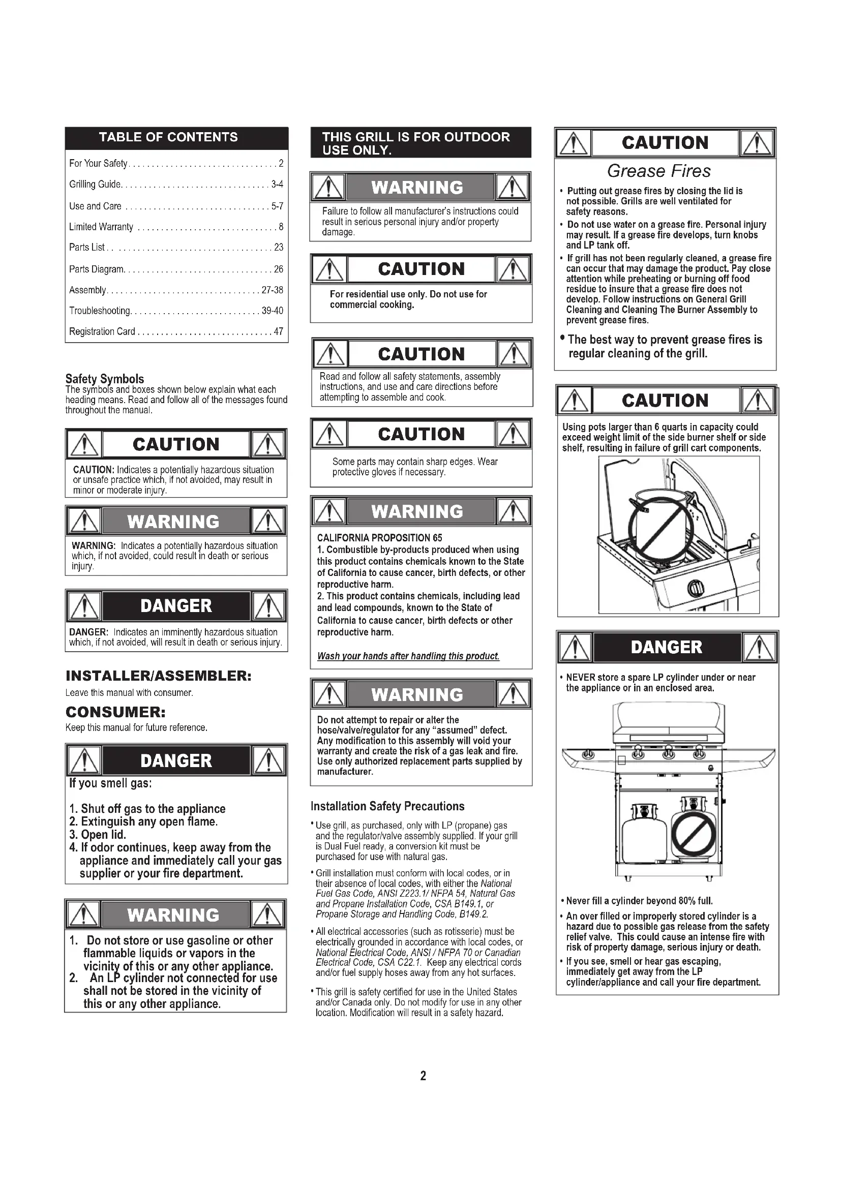 USE ONLY. Read and follow all safety statements, assembly instructions, and use and care directions before attempting to assemble and cook. INSTALLER/ASSEMBLER: Leave this manual with consumer. CONSUMER: Keep this manual for future reference. Failure to follow all manufacturer’s instructions could result in serious personal injury and/or property damage. Some parts may contain sharp edges. Wear protective gloves if necessary. For residential use only. Do not use for commercial cooking. WARNING DANGER If you smell gas: