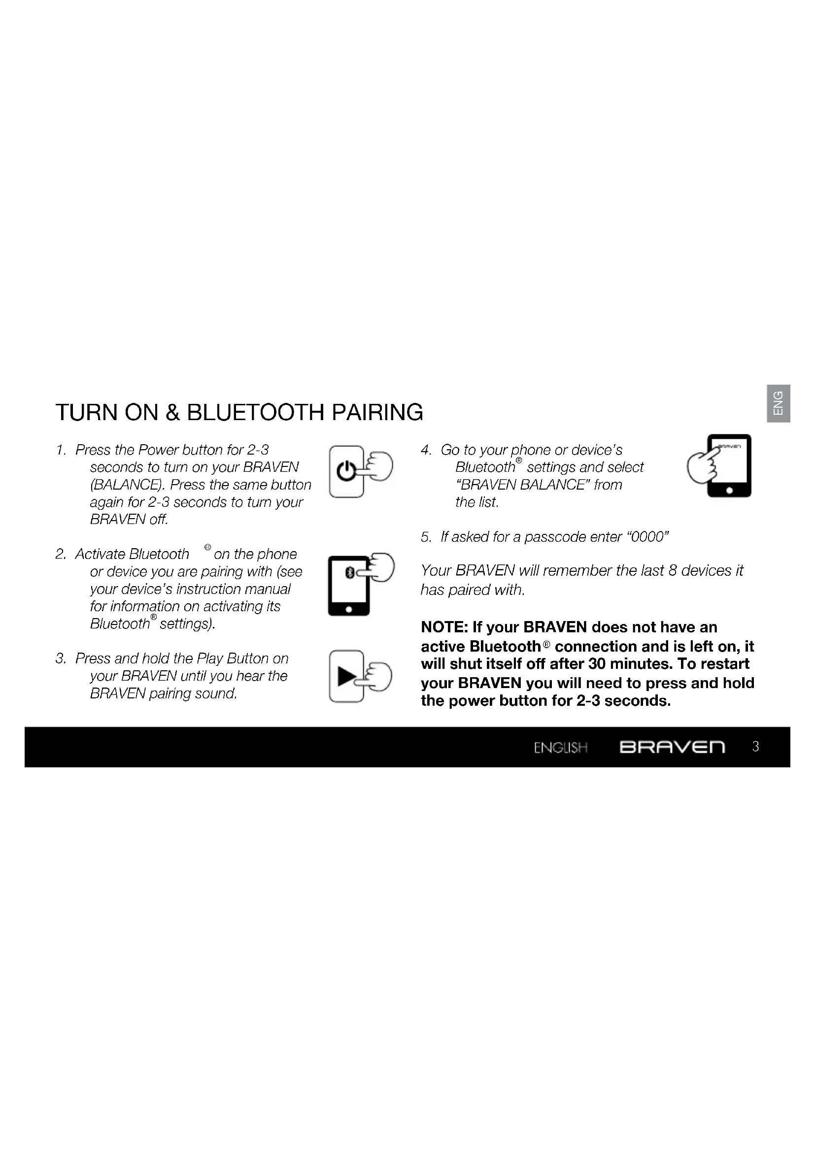 seconds to turn on your BRAVEN (BALANCE). Press the same button again for 2-3 seconds to turn your BRAVEN off.