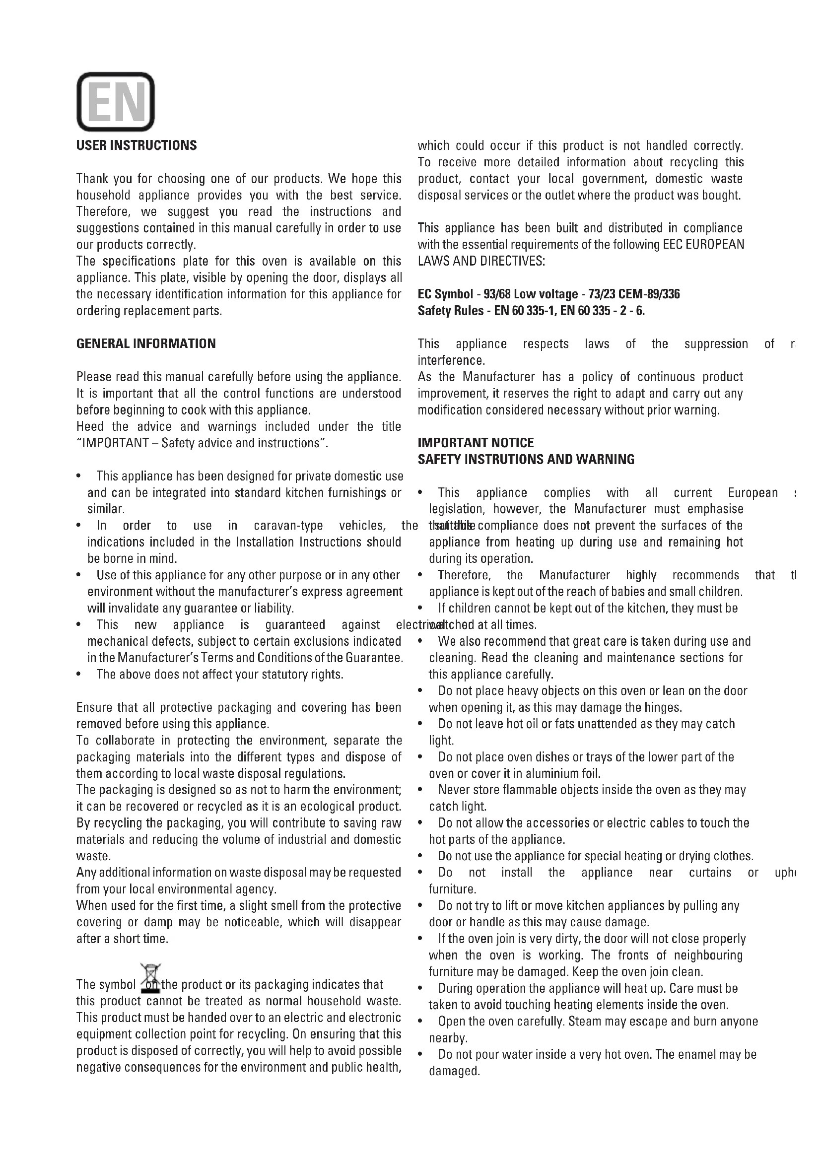 - Theabovedoesnotaffectyourstatutoryrights. Ensure that all protective packaging and covering has been removed before using this appliance. To collaborate in protecting the environment, separate the packaging materials into the different types and dispose of them according to local waste disposal regulations. The packaging is designed so as not to harm the environment; it can be recovered or recycled as it is an ecological product. By recycling the packaging, you will contribute to saving raw materials and reducing the volume of industrial and domestic waste. Any additional information on waste disposal may be requested from your local environmental agency. When used for the first time, a slight smell from the protective covering or damp may be noticeable, which will disappear after a short time. The symbol on the product or its packaging indicates that this product cannot be treated as normal household waste. This product must be handed over to an electric and electronic equipment collection point for recycling. On ensuring that this product is disposed of correctly, you will help to avoid possible negative consequences for the environment and public health, which could occur if this product is not handled correctly. To receive more detailed information about recycling this product, contact your local government, domestic waste disposal services or the outlet where the product was bought. This appliance has been built and distributed in compliance withtheessentialrequirementsofthefollowingEECEUROPEAN LAWS AND DIRECTIVES: EC Symbol - 93/68 Low voltage - 73/23 CEM-89/336 Safety Rules - EN 60 335-1, EN 60 335 - 2 - 6. This appliance respects laws of the suppression of radio- interference. As the Manufacturer has a policy of continuous product improvement, it reserves the right to adapt and carry out any modification considered necessary without prior warning. IMPORTANT NOTICE