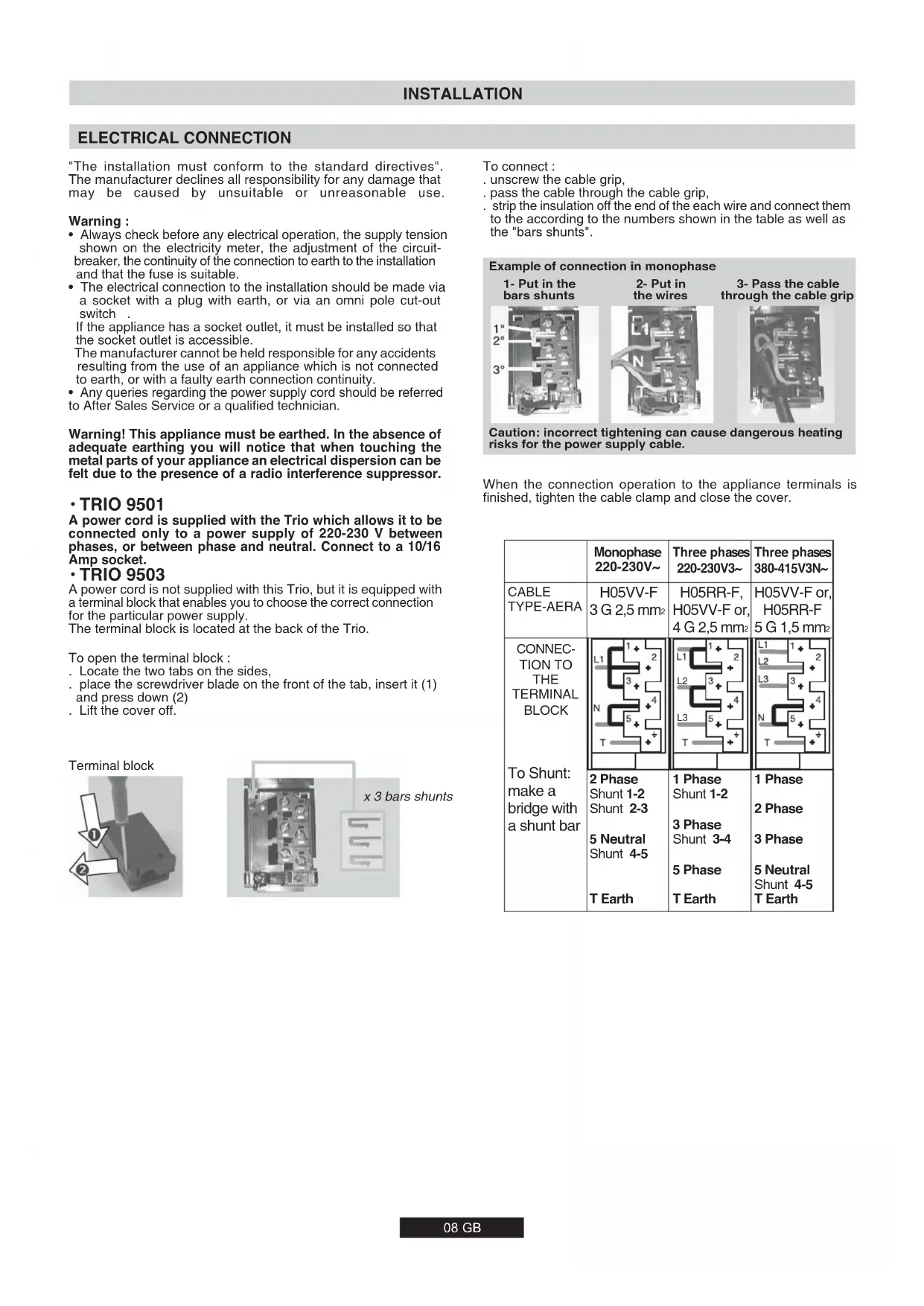 A power cord is not supplied with this Trio, but it is equipped with a terminal block that enables you to choose the correct connection for the particular power supply. The terminal block is located at the back of the Trio. To open the terminal block : . Locate the two tabs on the sides, . place the screwdriver blade on the front of the tab, insert it (1) and press down (2) . Lift the cover off. Terminal block x 3 bars shunts To connect : . unscrew the cable grip, . pass the cable through the cable grip, . strip the insulation off the end of the each wire and connect them to the according to the numbers shown in the table as well as the "bars shunts". INSTALLATION Example of connection in monophase1- Put in the bars shunts2- Put in the wires3- Pass the cable through the cable gripCaution: incorrect tightening can cause dangerous heating risks for the power supply cable. H05VV-F 3 G 2,5 mm