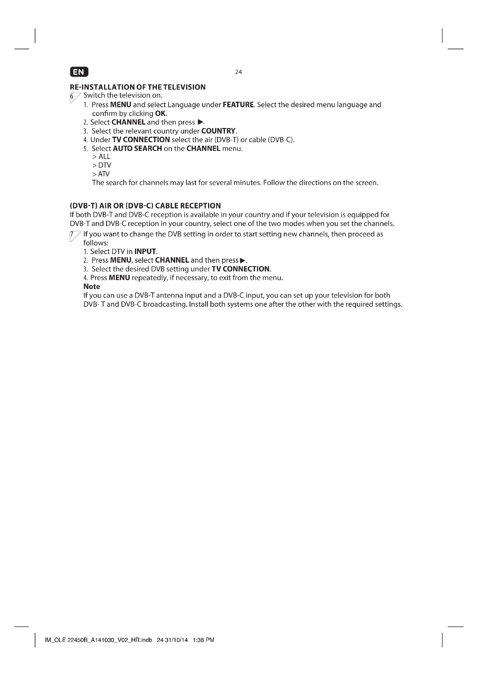 Note If you can use a DVB-T antenna input and a DVB-C input, you can set up your television for both DVB- T and DVB-C broadcasting. Install both systems one after the other with the required settings. IM_OLE 22450B_A141030_V02_HR.indb 24 31/10/14 1:38 PM25