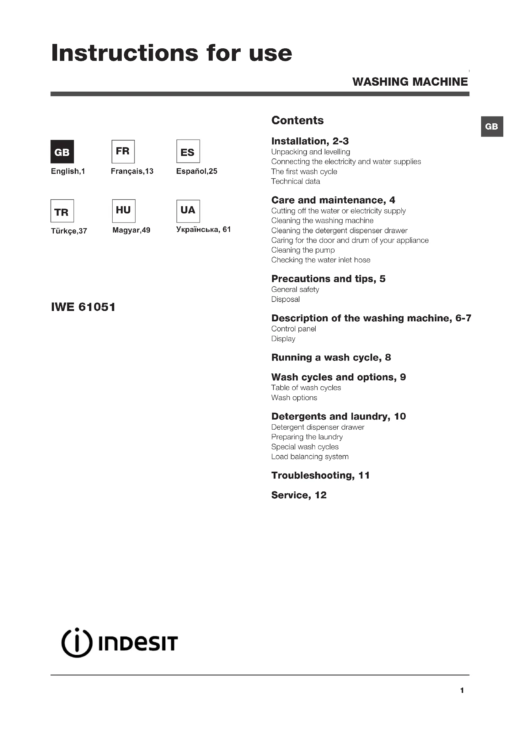 Contents Installation, 2-3 Unpacking and levelling Connecting the electricity and water supplies The first wash cycle Technical data Care and maintenance, 4 Cutting off the water or electricity supply Cleaning the washing machine Cleaning the detergent dispenser drawer Caring for the door and drum of your appliance Cleaning the pump Checking the water inlet hose Precautions and tips, 5 General safety Disposal Description of the washing machine, 6-7 Control panel Display Running a wash cycle, 8 Wash cycles and options, 9 Table of wash cycles Wash options Detergents and laundry, 10 Detergent dispenser drawer Preparing the laundry Special wash cycles Load balancing system Troubleshooting, 11 Service, 12 IWE 61051 Instructions for use WASHING MACHINE English,1