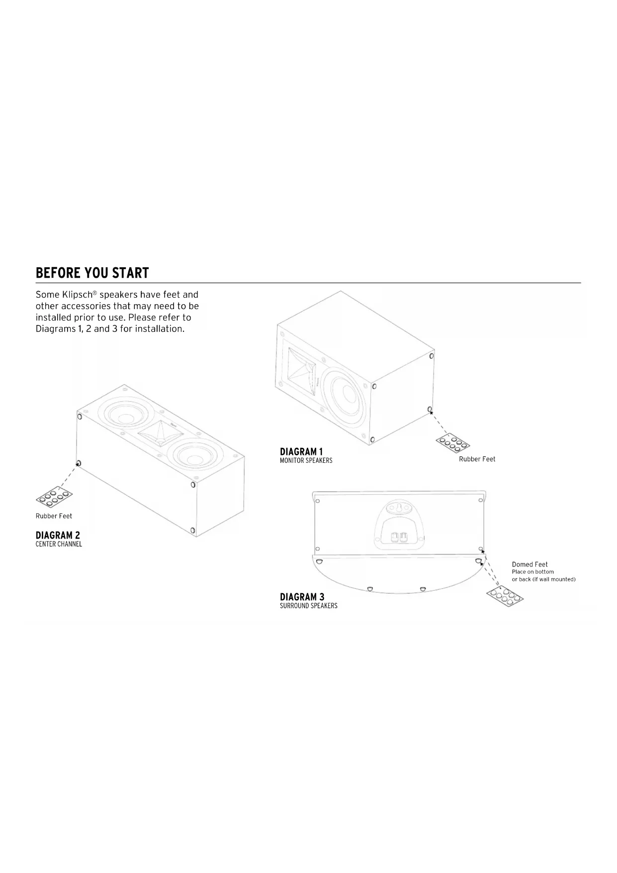 speakers have feet and other accessories that may need to be installed prior to use. Please refer to Diagrams 1, 2 and 3 for installation. DIAGRAM 1 MONITOR SPEAKERS DIAGRAM 2 CENTER CHANNEL DIAGRAM 3 SURROUND SPEAKERS Rubber Feet Rubber Feet Domed Feet Place on bottom or back (if wall mounted)ROOM PLACEMENT CONNECTION Left and Right Main Channel Speakers — For optimum performance, Klipsch Group, Inc. (KGI) suggests placing your speakers 6 to 15 feet (1.8 to 4.6m) apart. They may also be toed-in slightly for better stereo imaging. The listening position should be about 1 to 1.5 times the distance separating the speakers. Refer to Figures 1 and 3 for connection and placement. Center Channel Speakers — Center channel speakers are designed to place dialogue and primary sounds so that they appear to come from the video screen. The speakers should therefore be placed as close to the screen as possible, preferably directly on top of or below the screen. Refer to Figures 1, 2 and 3 for connection and placement. Rear Surround Channel Speakers — Klipsch WDST surround speakers should be placed approximately 2 feet above the listening position. Typically this will be about 5-7 feet above the floor. The surrounds should be placed on the walls directly adjacent to the listening position. Another option would be on the wall behind the listening position. The final surround speaker placement depends on your room’s characteristics. They are designed to recreate the sense of space and ambience that many of today’s surround sound technologies provide. Refer to Figures 1, 3 and 4 for connection and placement. Please note that surround grilles are fixed and cannot be removed. Conventional Connection — Using 16-12 gauge speaker wire, connect the RED “positive” (+) terminal of the LEFT speaker to the RED “positive” (+) terminal of your amplifier’s LEFT channel. Connect the BLACK “negative” (–) terminal of the LEFT speaker to the BLACK “negative” (–) terminal of your amplifier’s LEFT channel. Repeat this procedure for connecting all remaining speakers to the appropriate amplifier channels. Refer to Figure 3. Make sure that no bare wires from any of the connections touch any other terminals as this could cause a short and damage your equipment. Some Klipsch Reference speakers come with dual binding posts that are connected by a metal strip. Do not remove this strip or your speakers will not function correctly. Keep this strip in place and connect your speaker wire to the top set of the binding posts. It is possible to “Bi-wire” a speaker that has two sets of binding posts. Please see your receiver’s manual for further instructions. Amplifier Requirements — Klipsch speakers are highly efficient and will operate easily on a wide variety of amplifiers. All Klipsch speakers are 8-ohm compatible and can be driven to very high levels with low distortion. Due to the high output levels Klipsch speakers are capable of reproducing, exercise caution with the volume control. Excessive volume over long periods can permanently damage your hearing. Overdriving your amplifier could also damage your speakers. Check with your dealer or amplifier manual to make sure your particular amplifier is best suited to your application. We want you listening for a lifetime.FIGURE 1