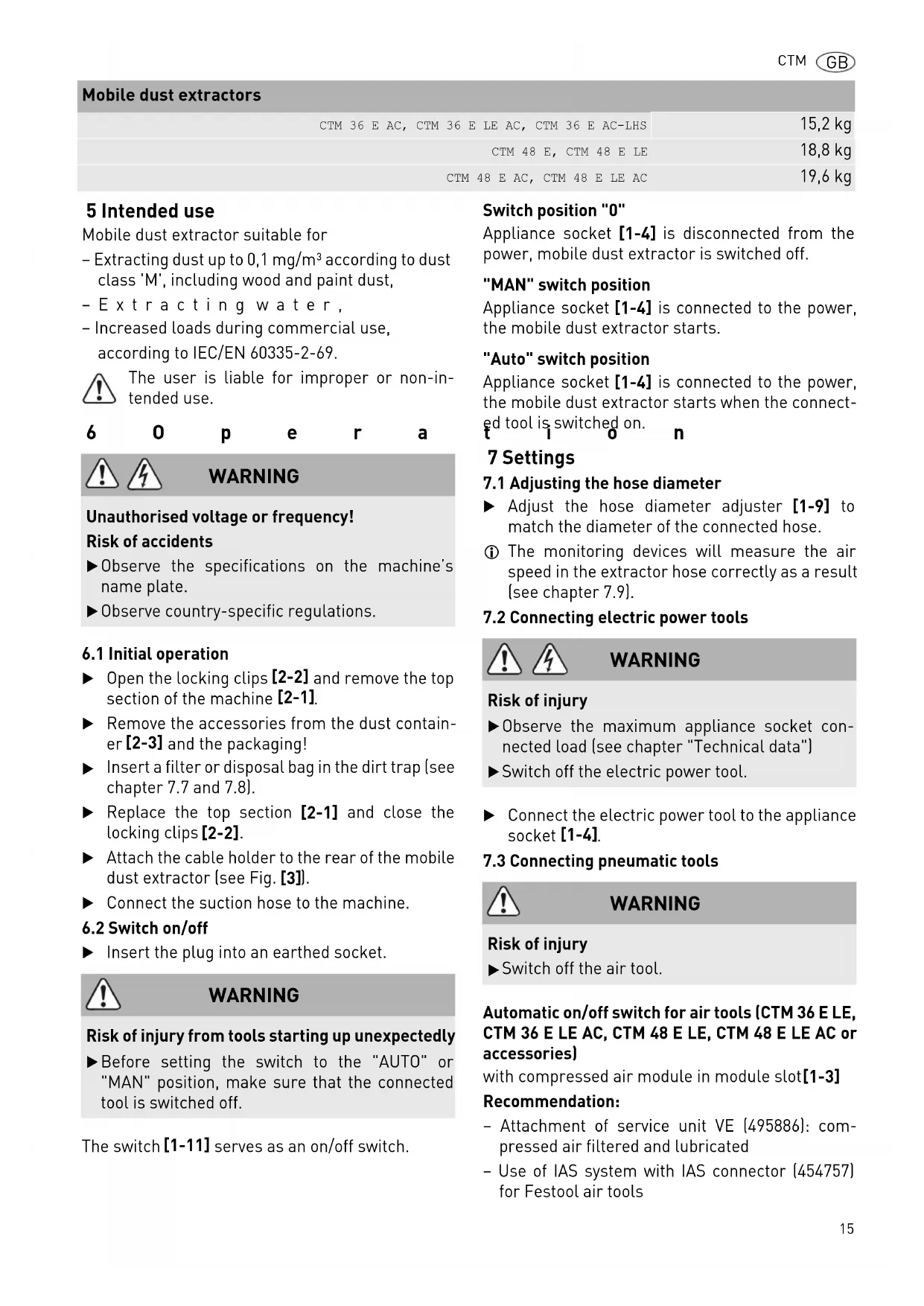 2Symbols 3 Machine features The specified illustrations appear at the beginning of the Operating Instructions. 4Technical data Symbol Significance Warning of general danger Risk of electric shock Read operating instructions and safety notices! Wear a dust mask. Tip or advice Handling instruction Warning! The machine may contain haz- ardous dust! Do not dispose of as domestic waste. [1-1] Sealing plug [1-2] Intake opening [1-3] Module slot (compressed air module for CTM 36 E LE, CTM 36 E LE AC, CTM 48 E LE, CTM 48 E LE AC) [1-4] Appliance socket [1-5] Hose store [1-6] Handle [1-7] SysDoc [1-8] Automatic cleaning (only versions with AutoClean) [1-9] Hose diameter setting [1-10] Suction power adjuster [1-11] Switch [1-12] Locking clip [1-13] Dust container [1-15] Brake Mobile dust extractors Power consumption 350 - 1200 W Maximum appliance socket con- nected load