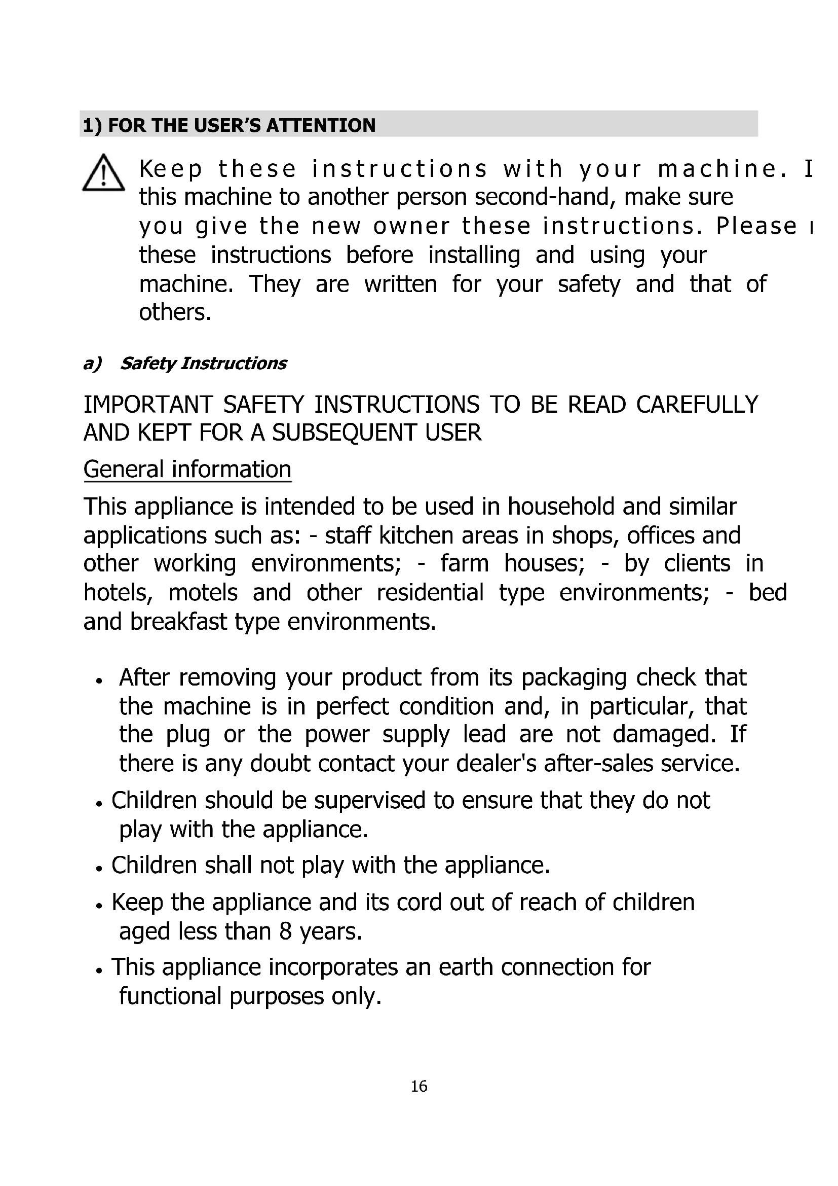 eep these instructions with your machine. If you sell this machine to another person second-hand, make sure you give the new owner these instructions. Please read these instructions before installing and using your machine. They are written for your safety and that of others. a) Safety Instructions IMPORTANT SAFETY INSTRUCTIONS TO BE READ CAREFULLY