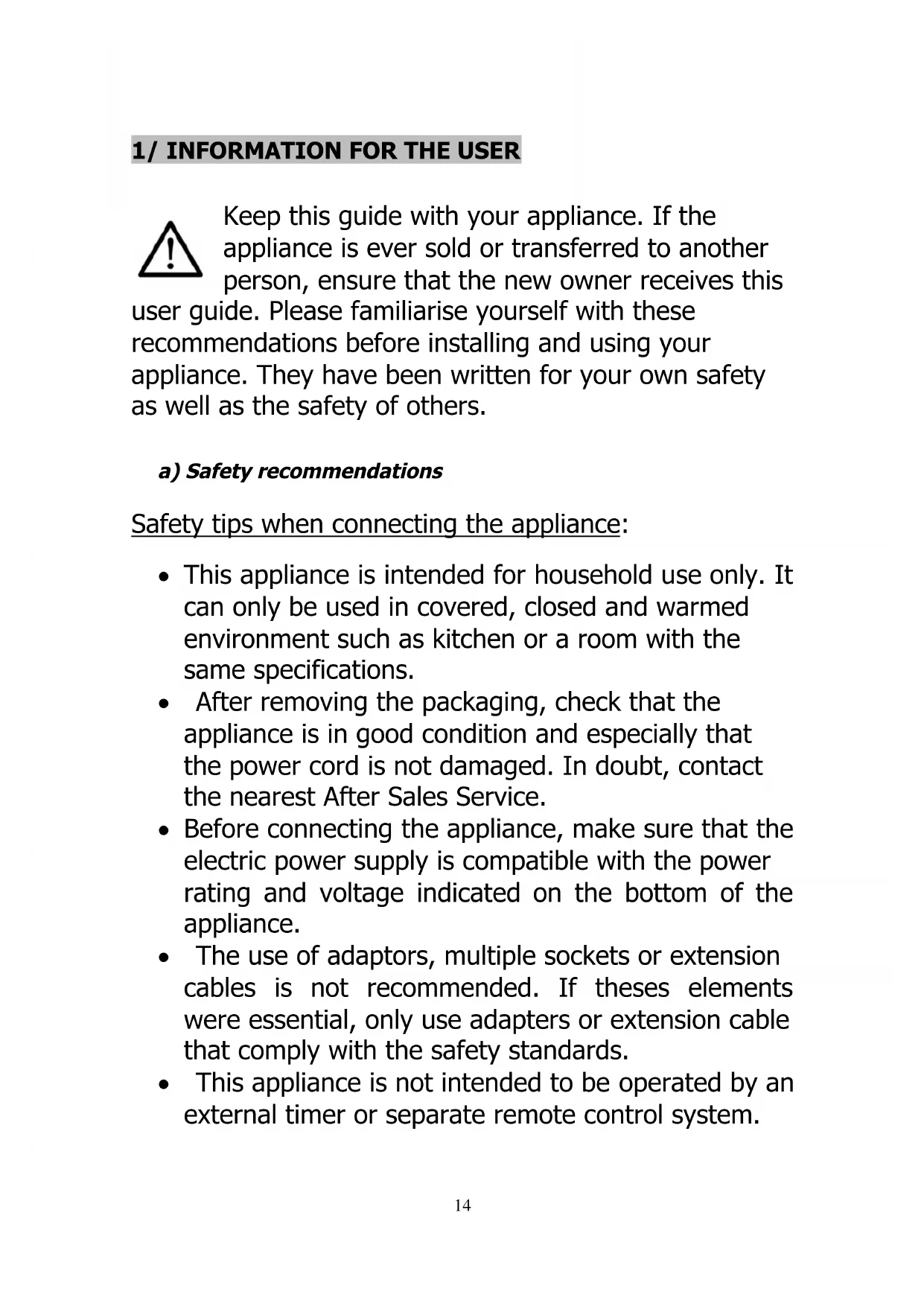 Keep this guide with your appliance. If the appliance is ever sold or transferred to another person, ensure that the new owner receives this user guide. Please familiarise yourself with these recommendations before installing and using your appliance. They have been written for your own safety as well as the safety of others. a) Safety recommendations Safety tips when connecting the appliance: This appliance is intended for household use only. It can only be used in covered, closed and warmed environment such as kitchen or a room with the same specifications. After removing the packaging, check that the appliance is in good condition and especially that the power cord is not damaged. In doubt, contact the nearest After Sales Service. Before connecting the appliance, make sure that the electric power supply is compatible with the power rating and voltage indicated on the bottom of the appliance. The use of adaptors, multiple sockets or extension cables is not recommended. If theses elements were essential, only use adapters or extension cable that comply with the safety standards. This appliance is not intended to be operated by an external timer or separate remote control system.15 Place the appliance on a dry, stable and smooth surface. Keep the appliance and its cord out of reach of children under 8 years. Do not insert any objects into slots or holes of the kettle. Do not use the base unit of another kettle. Only use the supplied base unit. Children shall not play with the appliance. Safety tips when using the appliance: This appliance can be used by children aged from 8 years and above if they have been given supervision or instruction concerning use of the appliance in a safe way and if they understand the hazards involved. This appliance can be used by persons with reduced physical, sensory or mental capabilities or lack of experience and knowledge if they have given supervision or instruction concerning use of the appliance in a safe way and it they understand the hazards involved. The appliance and its accessible parts become hot during the use. Children under the age of 8 years should not use this appliance unless continuous supervision by a responsible adult is given. Always grasp the kettle by the handle. Use this kettle only for heating water. Any other use may cause fire or injury.