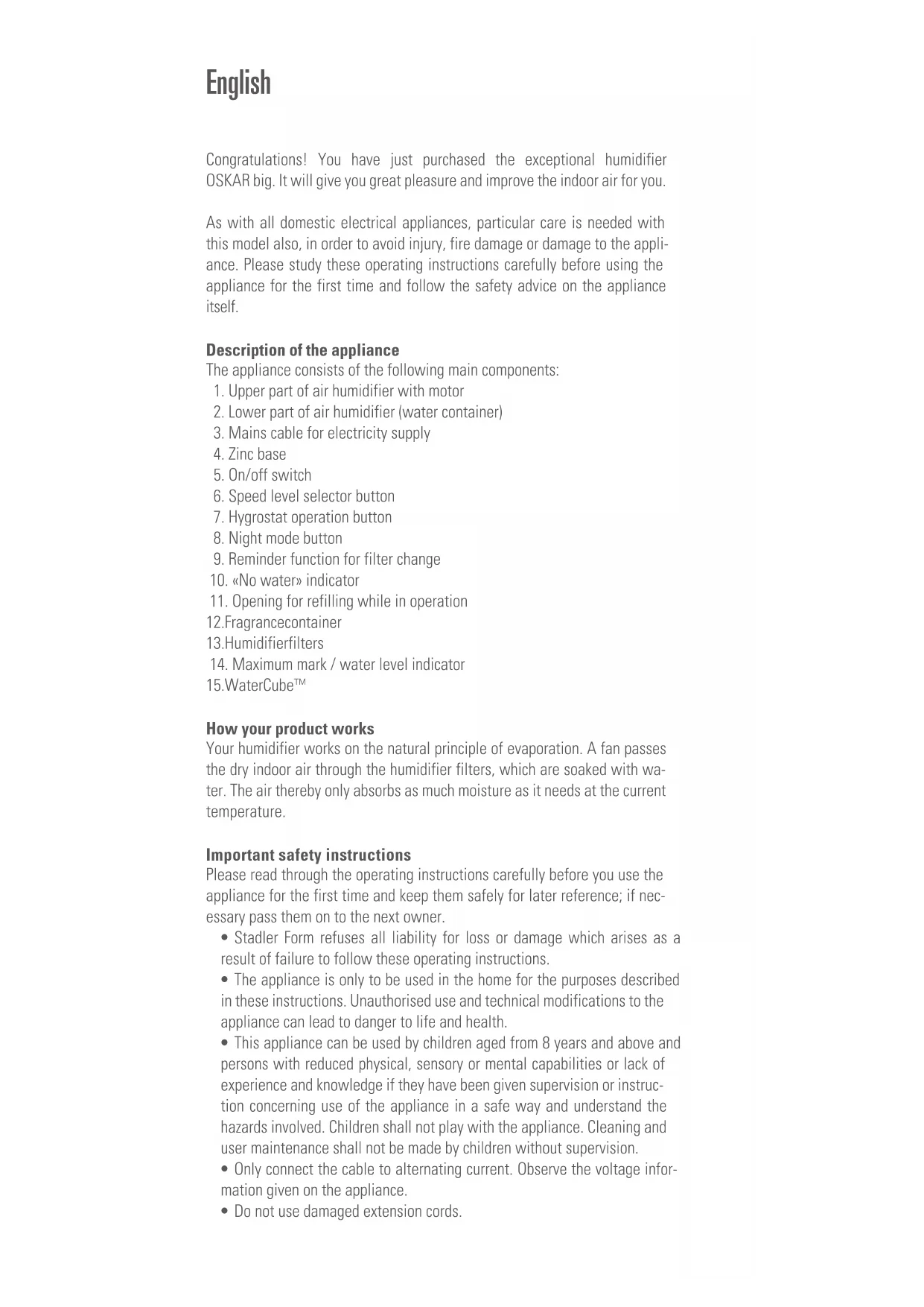 Download the instructions for your Humidifier in PDF format for free! Find your manual Oskar Big - STADLER FORM and take your electronic device back in hand. On this page are published all the documents necessary for the use of your device. Oskar Big by STADLER FORM.