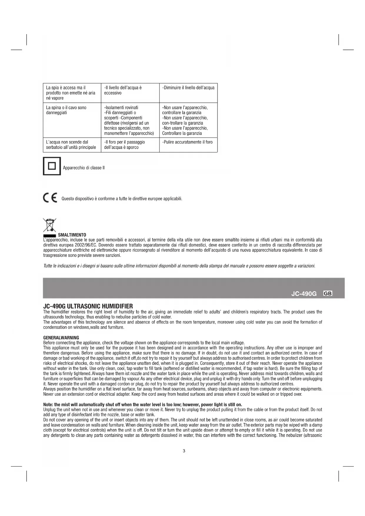 No power (Light indicator is off ) -Unit not plugged in -No power at outlet -Plug the unit in -Check circuits, fuses, test outlet with lamp No air or mist (and light indicator is on) -No water in the unit -Mist intensity level too low -Defective components (Non-serviceable) -Unit not in a level surface -Possible mineral deposits on nebulizer or sensor -Water tank was washed with detergent -Nebulizer worn or defective -Fill water tank -Set intensity level higher -See warranty -Place unit on a level surface -Clean nebulizer and sensor and refill with distilled water -Rinse thoroughly with clean water -See warranty Water tank is full but no mist (Light indicator is on) -Too much water in the unit -Reduce water Damaged plug or cord -Worn insulation -Damaged or exposed wires -Defective components (Non- serviceable) -Do not use product, see warranty -Do not use the product, see warranty -Do not use the product, see warranty Water do not fill the reservoir -The hole to let the water cool down is dirty -Clean carefully the hole IMPORTANT NOTICE This appliance is not intended for use by persons (including children) with reduced physical, sensory or mental capabilities, or lack of experience or knowledge, unless they have been given supervision or instruction concerning the use of the appliance by a person responsible for their safety. Children should be supervised to ensure they do not play with the appliance. If the power cord is damaged it must be replaced by the builder or by its technical service or, in any case, by a person holding similar qualification in order to avoid whatsoever hazard. Class II appliance This item is made in conformity with all the applicable European directives DISPOSAL The device (including its removable parts and accessories) must not be disposed of together with municipal waste at the end of its life, but in compliance with European Directive 2002/96/EC. Since it must be handled separately from household waste, either carry it to a separately collected waste disposal centre for electrical and electronic appliances or give it back to the retailer on purchasing a new device with the same purpose. Any infringement will be severely prosecuted. Specifications and designs are based on the latest information available at the time of printing and subject to change without notice.6