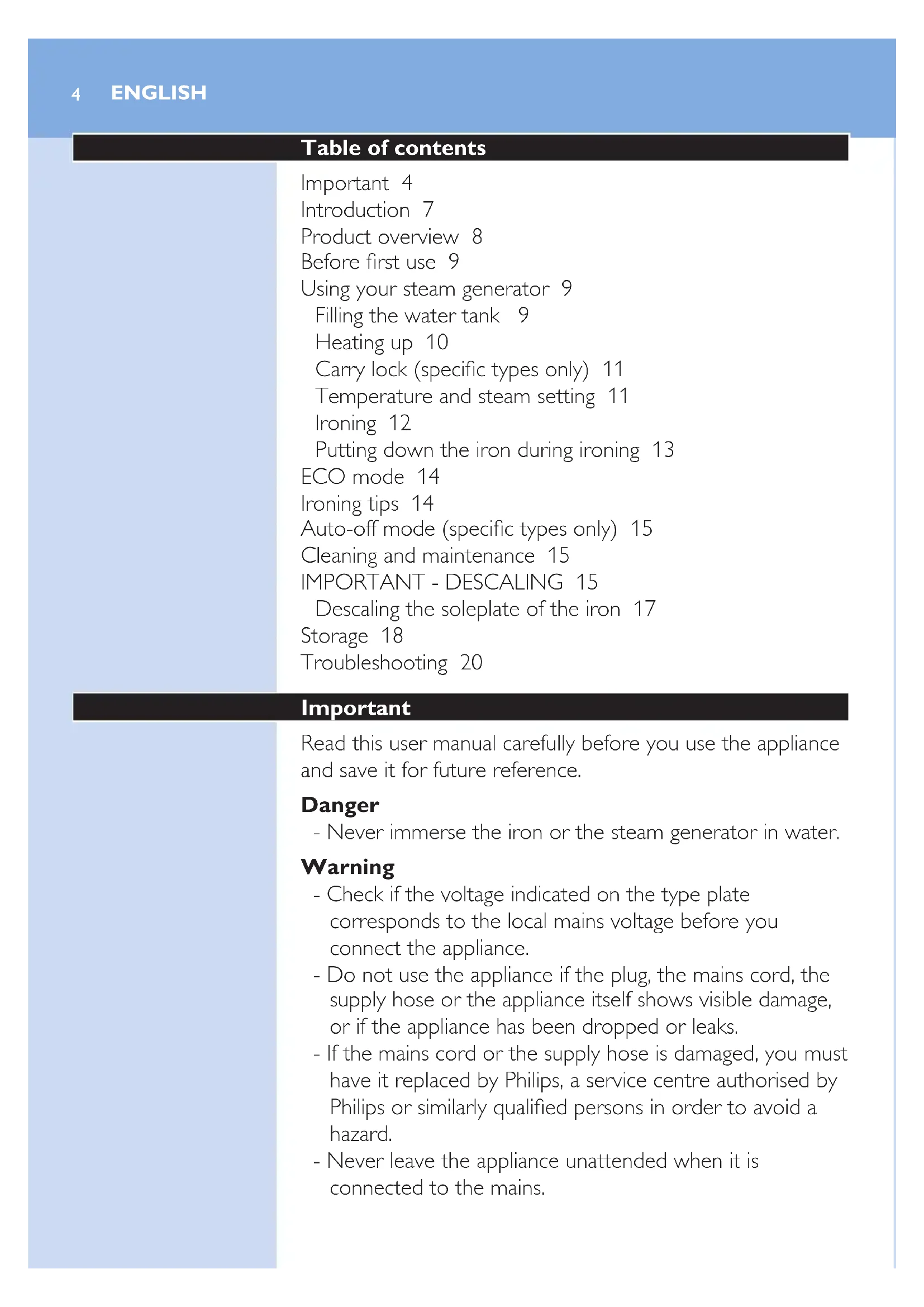 Descaling the soleplate of the iron 17 Storage 18 Troubleshooting 20 Important Read this user manual carefully before you use the appliance and save it for future reference. Danger - Never immerse the iron or the steam generator in water. Warning - Check if the voltage indicated on the type plate corresponds to the local mains voltage before you connect the appliance. - Do not use the appliance if the plug, the mains cord, the supply hose or the appliance itself shows visible damage, or if the appliance has been dropped or leaks. - If the mains cord or the supply hose is damaged, you must have it replaced by Philips, a service centre authorised by Philips or similarly qualied persons in order to avoid a hazard. - Never leave the appliance unattended when it is connected to the mains. ENGLISH- This appliance can be used by children aged 8 or above and by persons with reduced physical, sensory or mental capabilities or lack of experience and knowledge if they have been given instructions in safe use of the appliance or supervision to establish safe use and if they have been made aware of the hazards involved. - Do not allow children to play with the appliance. - Keep the iron and its mains cord out of the reach of children aged 8 or under when the appliance is switched on or cooling down. - Children are not allowed to clean the appliance and perform the Calc-Clean procedure without supervision. - Do not let the mains cord and supply hose come into contact with the hot soleplate of the iron. - If steam or hot water droplets escape from under the EASY DE-CALC knob when the appliance heats up, switch off the appliance and let it cool down for 2 hours. Then reinsert the EASY DE-CALC knob. If steam continues to escape when the appliance heats up, switch off the appliance and contact a service centre authorised by Philips. - Do not remove the EASY DE-CALC knob from the steam generator when the steam generator is still hot or under pressure. - Do not use any other cap on the steam generator than the EASY DE-CALC knob that has been supplied with the appliance. Caution - Only connect the appliance to an earthed wall socket. - Always place and use the steam generator on a stable, level and horizontal surface. - Check the mains cord and the supply hose regularly for possible damage. - Fully unwind the mains cord before you plug it in the wall socket. - The iron platform and the soleplate of the iron can become extremely hot and may cause burns if touched. If you want to move the steam generator, do not touch the iron platform. ENGLISH 5- Always switch off the appliance and remove the plug from the wall socket when you have nished ironing. - Put the iron back on the iron platform, switch off the appliance and remove the mains plug from the wall socket: - a. when you have nished ironing - b. when you clean the appliance - b. when you ll or empty the water tank - c. when you leave the iron, even if it is only for a short while - Descale the steam generator regularly according to the instructions in chapter ‘Cleaning and maintenance’. - This appliance is intended for indoor household use only. Electromagnetic elds (EMF) This Philips appliance complies with all standards regarding electromagnetic elds (EMF). If handled properly and according to the instructions in this user manual, the appliance is safe to use based on scientic evidence available today. Disposal - Do not throw away the appliance with the normal household waste at the end of its life, but hand it in at an ofcial collection point for recycling. By doing this, you help to preserve the environment. - To make recycling possible, the plastic parts used for this appliance have been coded. The cardboard packaging is made of 90% recycled material and is fully recyclable. ENGLISH6Introduction Thank you for buying this Philips steam generator. - The new Philips PerfectCare offers you an innovative way to iron your garments. We all know the fuss with traditional irons: choosing the right temperature for your tough and delicate fabrics, waiting for the iron to warm up and cool down to avoid the risk of damaging clothes with a too hot iron. Those hassles are things of the past with the new Philips PerfectCare. - In principle, wrinkle removal is done by transferring heat to fabric. Historically, this was done with a very hot soleplate. Then steam was added to enhance heat transfer, thus making ironing much faster. Our research conrmed that the best way to remove wrinkles effectively is a perfect combination of intense steam and optimal soleplate temperature. The key to effective wrinkle removal is the steam not the soleplate temperature. The soleplate temperature needs to be just above the steam temperature to remove any moisture. This is the optimal temperature. - In the past, high amount of steam at this optimal temperature would have led to water leakage. We developed a unique patented cyclonic chamber to maintain high-pressure steam that penetrates deep into the fabric for fast ironing with no risk of water leakage. - Ironing is now truly simple - no temperature adjustment, no scorching, no waiting time on heating up and cooling down. It is faster, no matter who does the ironing. With this OptimalTemp technology, every single garment can be ironed effectively and safely. - This iron has been approved by The Woolmark Company Pty Ltd for the ironing of wool only products provided that the garments are ironed according to the instructions on the garment label and those issued by the manufacturer of this iron. R1101. In United Kingdom, Eire, Hong Kong and India, the Woolmark trademark is a Certication trademark. EnGlish 7EnGlish8 Product overview 1 Steam supply hose 2 Iron platform 3 ECO button with light 4 On/off button with power-on light 5 EASY DE-CALC light 6 User manual 7 Worldwide guarantee leaet 8 Mains cord with plug 9 EASY DE-CALC knob 10 Supply hose storage compartment 11 Water tank with water level indication 12 Filling funnel lid 13 Carr