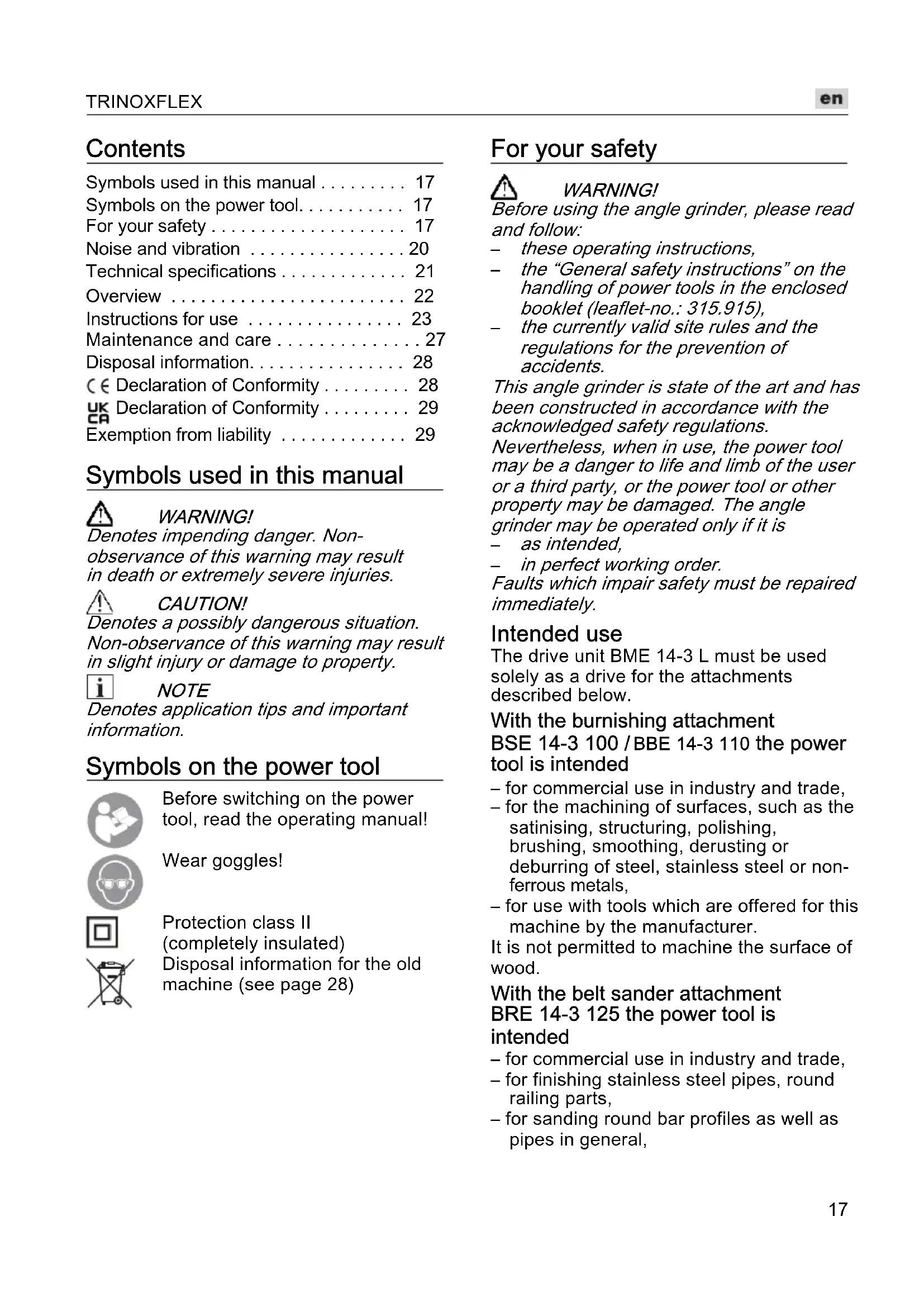 in perfect working order. Faults which impair safety must be repaired immediately. Intended use The drive unit BME 14-3 L must be used solely as a drive for the attachments described below. With the burnishing attachment BSE 14-3 100 / BBE 14-3 110 the power tool is intended – for commercial use in industry and trade, – for the machining of surfaces, such as the satinising, structuring, polishing, brushing, smoothing, derusting or deburring of steel, stainless steel or non- ferrous metals, – for use with tools which are offered for this machine by the manufacturer. It is not permitted to machine the surface of wood. With the belt sander attachment BRE 14-3 125 the power tool is intended – for commercial use in industry and trade, – for finishing stainless steel pipes, round railing parts, – for sanding round bar profiles as well as pipes in general,TRINOXFLEX