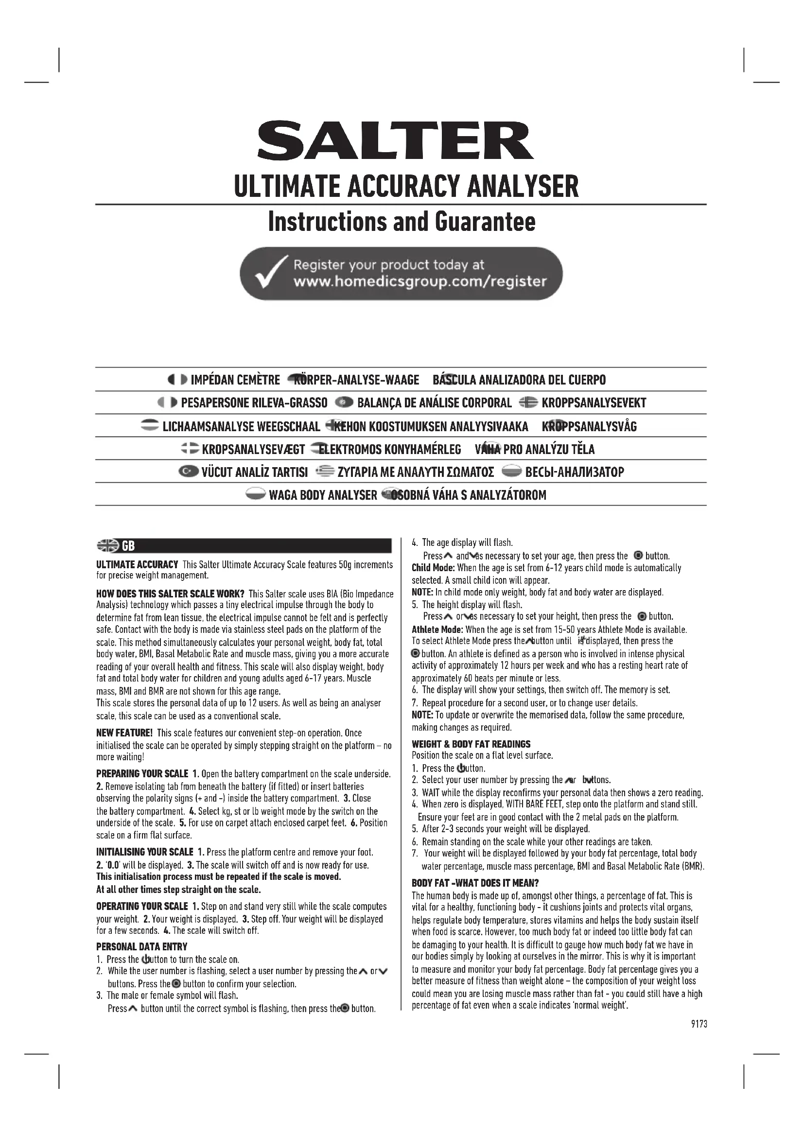 ULTIMATE ACCURACY This Salter Ultimate Accuracy Scale features 50g increments for precise weight management.HOW DOES THIS SALTER SCALE WORK? This Salter scale uses BIA (Bio Impedance Analysis) technology which passes a tiny electrical impulse through the body to determine fat from lean tissue, the electrical impulse cannot be felt and is perfectly safe. Contact with the body is made via stainless steel pads on the platform of the scale. This method simultaneously calculates your personal weight, body fat, total body water, BMI, Basal Metabolic Rate and muscle mass, giving you a more accurate reading of your overall health and fitness. This scale will also display weight, body fat and total body water for children and young adults aged 6-17 years. Muscle mass, BMI and BMR are not shown for this age range.This scale stores the personal data of up to 12 users. As well as being an analyser scale, this scale can be used as a conventional scale.NEW FEATURE! This scale features our convenient step-on operation. Once initialised the scale can be operated by simply stepping straight on the platform – no more waiting! PREPARING YOUR SCALE 1. Open the battery compartment on the scale underside.