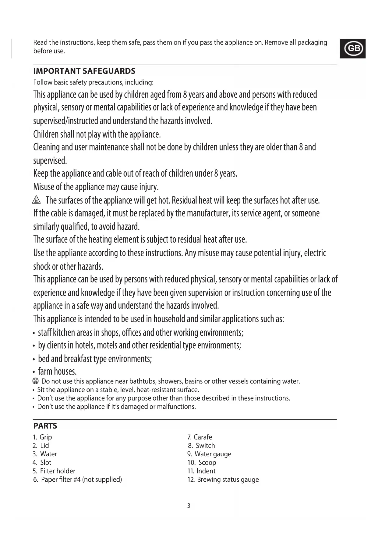 Read the instructions, keep them safe, pass them on if you pass the appliance on. Remove all packaging before use. IMPORTANT SAFEGUARDS Follow basic safety precautions, including: This appliance can be used by children aged from 8 years and above and persons with reduced physical, sensory or mental capabilities or lack of experience and knowledge if they have been supervised/instructed and understand the hazards involved. Children shall not play with the appliance. Cleaning and user maintenance shall not be done by children unless they are older than 8 and supervised. Keep the appliance and cable out of reach of children under 8 years. Misuse of the appliance may cause injury. h The surfaces of the appliance will get hot. Residual heat will keep the surfaces hot after use. If the cable is damaged, it must be replaced by the manufacturer, its service agent, or someone similarly qualified, to avoid hazard. The surface of the heating element is subject to residual heat after use. Use the appliance according to these instructions. Any misuse may cause potential injury, electric shock or other hazards. This appliance can be used by persons with reduced physical, sensory or mental capabilities or lack of experience and knowledge if they have been given supervision or instruction concerning use of the appliance in a safe way and understand the hazards involved. This appliance is intended to be used in household and similar applications such as: