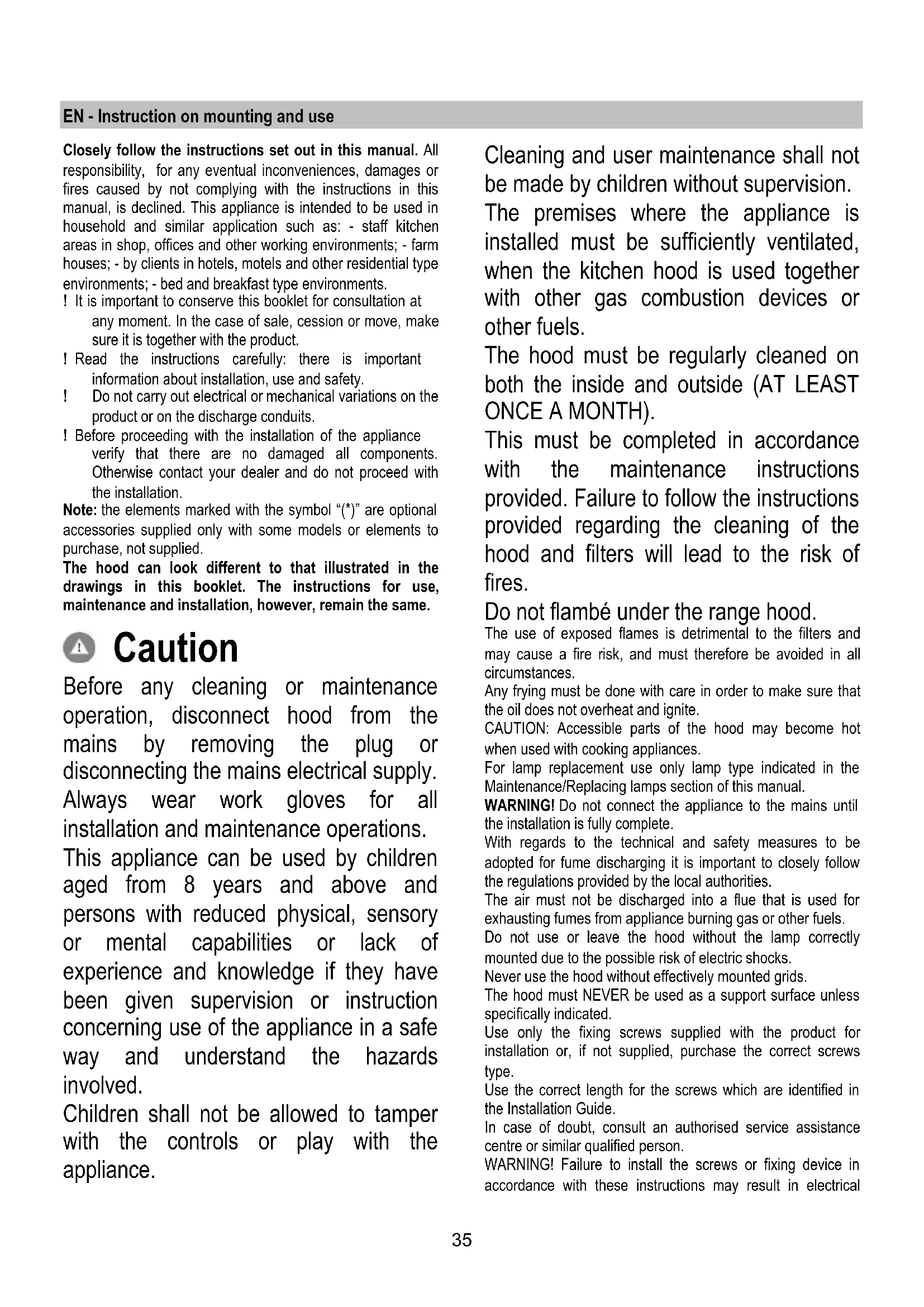 - Check (for transport reasons) that there is no other supplied material inside the hood (e.g. packets with screws (*), guarantees (*), etc.), eventually removing them and keeping them. This type of cooker hood must be fixed to the ceiling. Very heavy product; hood handling and installation must be carried out by at least two persons. Expansion wall plugs are provided to secure the hood to most types of walls/ceilings. However, a qualified technician must verify suitability of the materials in accordance with the type of wall/ceiling. The wall/ceiling must be strong enough to take the weight of the hood. Do not tile, grout or silicone this appliance to the wall. Surface mounting only.37 Operation The hood has an on-board controller which can also be used with the specific remote control (only supplied on some models) Control panel on hood