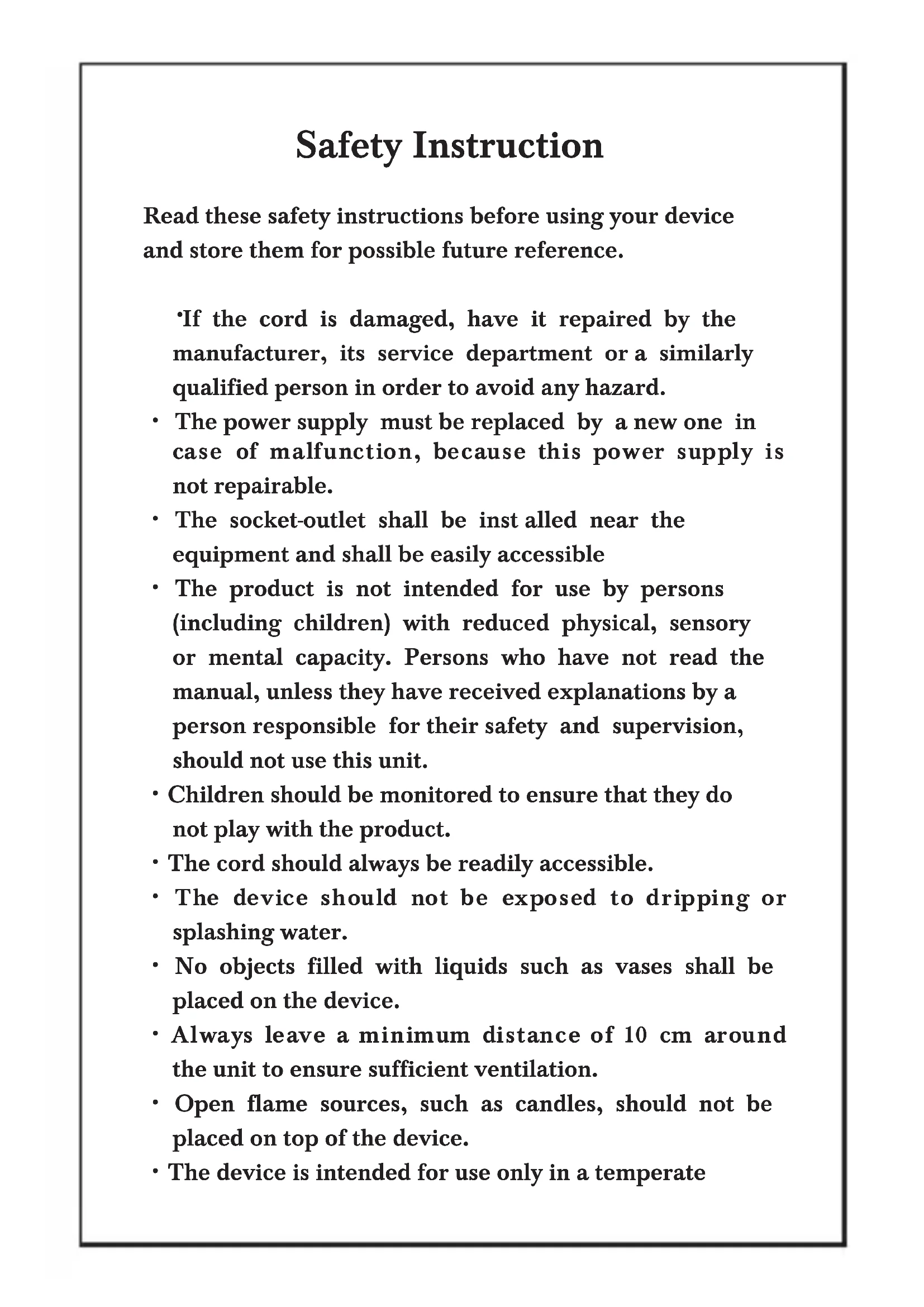 - The product is not intended for use by persons (including children) with reduced physical, sensory or mental capacity. Persons who have not read the manual, unless they have received explanations by a person responsible for their safety and supervision, should not use this unit.