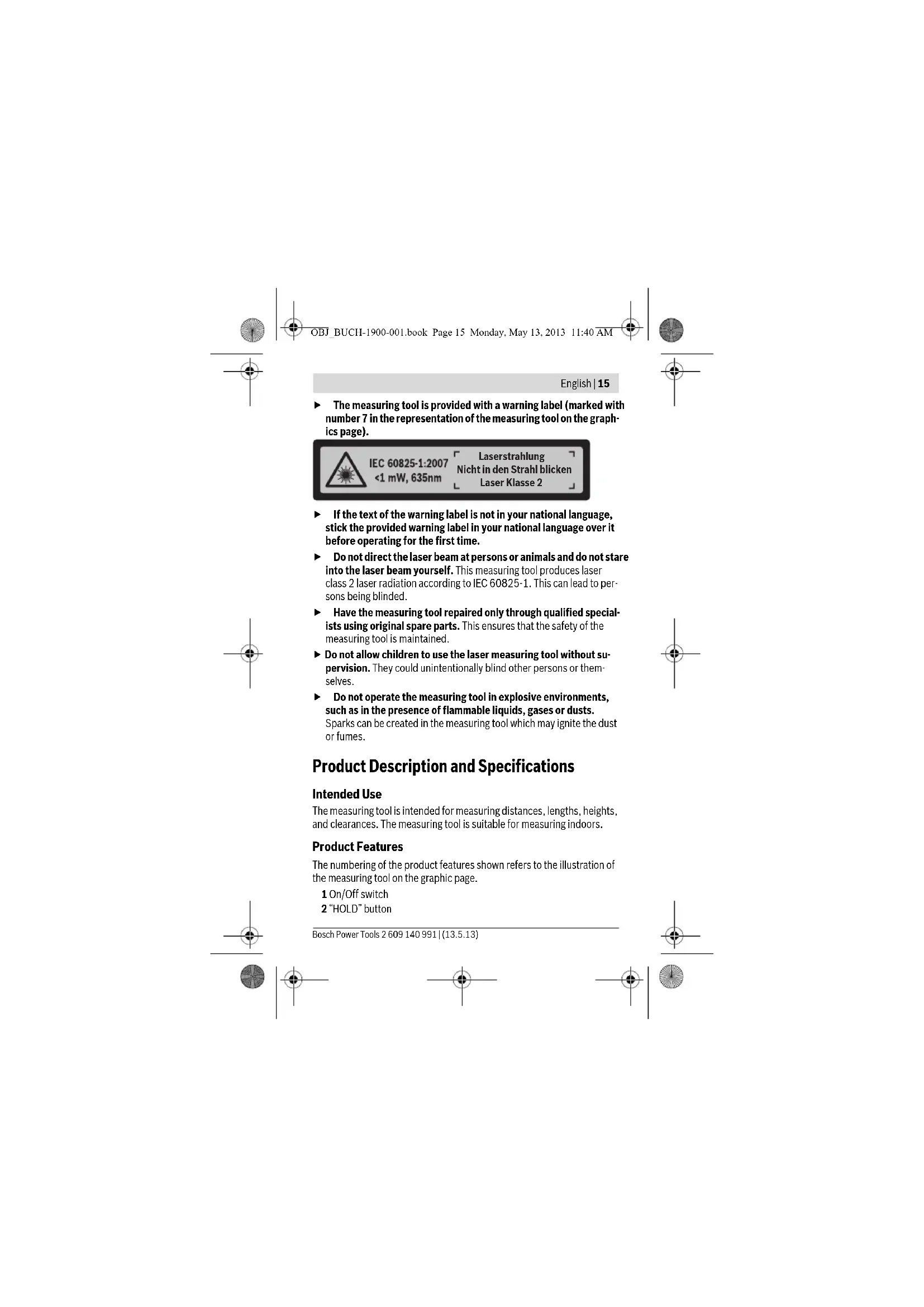 Laser type 635 nm, <1 mW Laser beam diameter (at 25 °C) and at 10 m distance, approx. 9mm OBJ_BUCH-1900-001.book Page 16 Monday, May 13, 2013 11:40 AMEnglish | 17 Bosch Power Tools 2 609 140 991 | (13.5.13) Assembly Inserting/Replacing the Batteries Alkali-manganese batteries are recommended for the measuring tool. To open the battery lid 4, press the latch 5 in the direction of the arrow and remove the battery lid. Insert the batteries. When inserting, pay at- tention to the correct polarity according to the representation on the in- side of the battery compartment. When the battery symbol appears for the first time on the display, measurements are still possible for approx. 15 minutes. When the battery symbol flashes, the batteries must be replaced; measurements are no longer possible. Replace all batteries at the same time. Only use same-brand batteries with the identical battery capacity. Batteries 2 x 1.5 V LR03 (AAA) Battery service life in measuring operation, ap- prox.