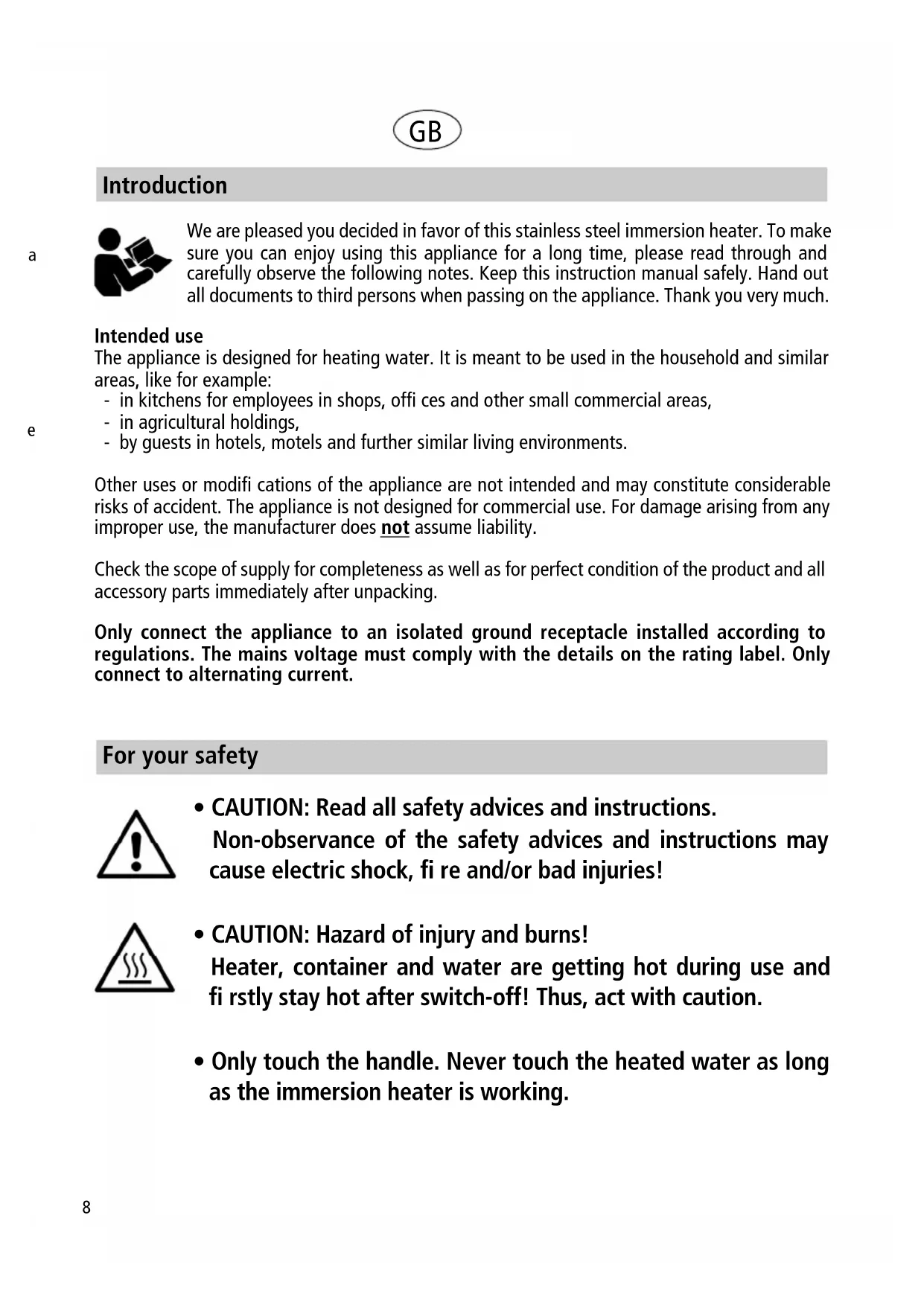 - Only touch the handle. Never touch the heated water as long as the immersion heater is working.9 General safety advices: