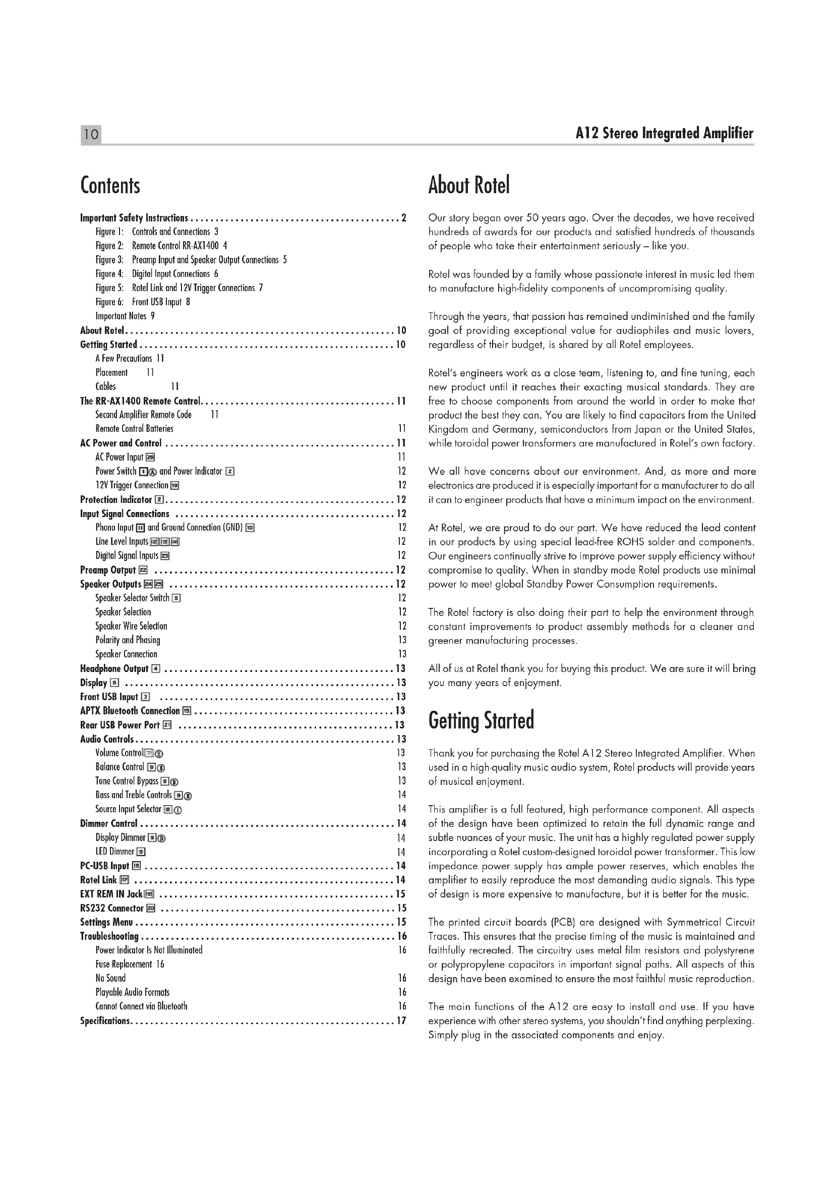 - de volumeregelaar van de voorversterker geheel dicht te draaien (volkomen naar links) wanneer u uw eindversterker aan- of uitzet. Note importanti Quando effettuate i collegamenti assicuratevi di: 4 Spegnere tutti i componenti del sistema prima di collegare qualsiasi componente, inclusi i diffusori. 4 Spegnere tutti i componenti del sistema prima di modificare qualsiasi connessione nel sistema. Vi raccomandiamo inoltre di: 4 Portare il volume a zero prima di accendere o spegnere l’amplificatore. Viktigt Tänk på följande när du gör anslutningar: 4 Stäng av alla apparater i anläggningen innan du ansluter nya komponenter eller högtalare. 4 Stäng av alla apparater i anläggningen innan du ändrar någon anslutning. Du rekommenderas också: 4 Vrid ner volymen på förförstärkaren helt och hållet innan förstärkaren slås på eller av. Важные замечания Перед подсоединением: 4 Выключите все компоненты, включая колонки. 4 Выключите все компоненты в вашей системе, прежде чем что-то в ней менять. Рекомендуется также: 4 Вывести громкость усилителя на минимум, перед тем как включать или выключать его.10 A12 Stereo Integrated Amplier About Rotel Our story began over 50 years ago. Over the decades, we have received hundreds of awards for our products and satised hundreds of thousands of people who take their entertainment seriously – like you. Rotel was founded by a family whose passionate interest in music led them to manufacture high-delity components of uncompromising quality. Through the years, that passion has remained undiminished and the family goal of providing exceptional value for audiophiles and music lovers, regardless of their budget, is shared by all Rotel employees. Rotel’s engineers work as a close team, listening to, and ne tuning, each new product until it reaches their exacting musical standards. They are free to choose components from around the world in order to make that product the best they can. You are likely to nd capacitors from the United Kingdom and Germany, semiconductors from Japan or the United States, while toroidal power transformers are manufactured in Rotel’s own factory. We all have concerns about our environment. And, as more and more electronics are produced it is especially important for a manufacturer to do all it can to engineer products that have a minimum impact on the environment. At Rotel, we are proud to do our part. We have reduced the lead content in our products by using special lead-free ROHS solder and components. Our engineers continually strive to improve power supply efciency without compromise to quality. When in standby mode Rotel products use minimal power to meet global Standby Power Consumption requirements. The Rotel factory is also doing their part to help the environment through constant improvements to product assembly methods for a cleaner and greener manufacturing processes. All of us at Rotel thank you for buying this product. We are sure it will bring you many years of enjoyment. Getting Started Thank you for purchasing the Rotel A12 Stereo Integrated Amplier. When used in a high-quality music audio system, Rotel products will provide years of musical enjoyment. This amplier is a full featured, high performance component. All aspects of the design have been optimized to retain the full dynamic range and subtle nuances of your music. The unit has a highly regulated power supply incorporating a Rotel custom-designed toroidal power transformer. This low impedance power supply has ample power reserves, which enables the amplier to easily reproduce the most demanding audio signals. This type of design is more expensive to manufacture, but it is better for the music. The printed circuit boards (PCB) are designed with Symmetrical Circuit Traces. This ensures that the precise timing of the music is maintained and faithfully recreated. The circuitry uses metal lm resistors and polystyrene or polypropylene capacitors in important signal paths. All aspects of this design have been examined to ensure the most faithful music reproduction. The main functions of the A12 are easy to install and use. If you have experience with other stereo systems, you shouldn’t nd anything perplexing. Simply plug in the associated components and enjoy. Contents Important Safety Instructions p. 2