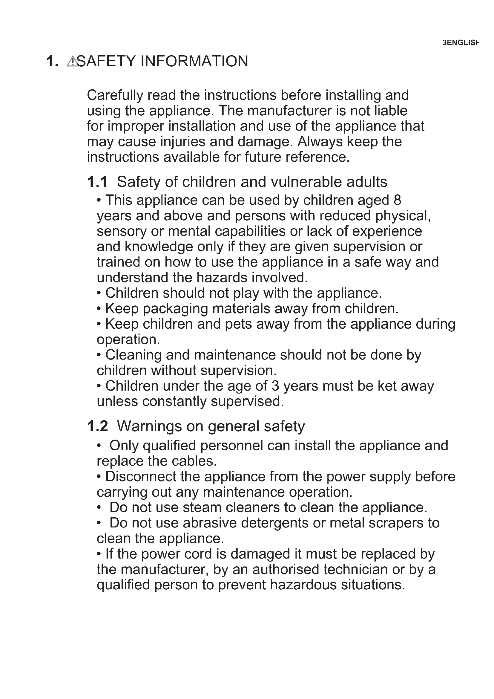 Carefully read the instructions before installing and using the appliance. The manufacturer is not liable for improper installation and use of the appliance that may cause injuries and damage. Always keep the instructions available for future reference.