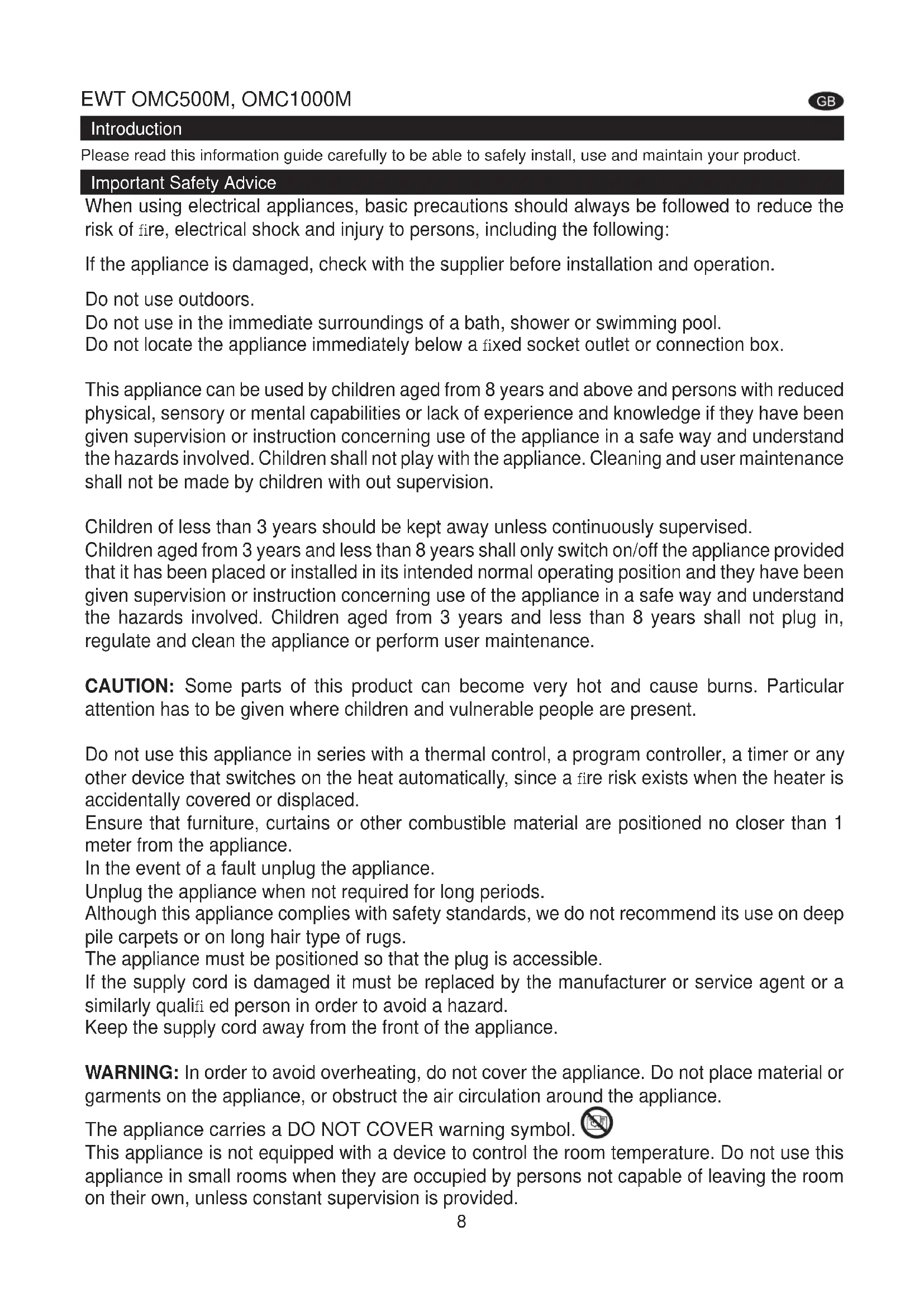 Important Safety Advice Introduction Please read this information guide carefully to be able to safely install, use and maintain your product. When using electrical appliances, basic precautions should always be followed to reduce the risk of fi re, electrical shock and injury to persons, including the following: If the appliance is damaged, check with the supplier before installation and operation. Do not use outdoors. Do not use in the immediate surroundings of a bath, shower or swimming pool. Do not locate the appliance immediately below a fi xed socket outlet or connection box. This appliance can be used by children aged from 8 years and above and persons with reduced physical, sensory or mental capabilities or lack of experience and knowledge if they have been given supervision or instruction concerning use of the appliance in a safe way and understand the hazards involved. Children shall not play with the appliance. Cleaning and user maintenance shall not be made by children with out supervision. Children of less than 3 years should be kept away unless continuously supervised. Children aged from 3 years and less than 8 years shall only switch on/off the appliance provided that it has been placed or installed in its intended normal operating position and they have been given supervision or instruction concerning use of the appliance in a safe way and understand the hazards involved. Children aged from 3 years and less than 8 years shall not plug in, regulate and clean the appliance or perform user maintenance. CAUTION: Some parts of this product can become very hot and cause burns. Particular attention has to be given where children and vulnerable people are present. Do not use this appliance in series with a thermal control, a program controller, a timer or any other device that switches on the heat automatically, since a fi re risk exists when the heater is accidentally covered or displaced. Ensure that furniture, curtains or other combustible material are positioned no closer than 1 meter from the appliance. In the event of a fault unplug the appliance. Unplug the appliance when not required for long periods. Although this appliance complies with safety standards, we do not recommend its use on deep pile carpets or on long hair type of rugs. The appliance must be positioned so that the plug is accessible. If the supply cord is damaged it must be replaced by the manufacturer or service agent or a similarly qualifi ed person in order to avoid a hazard. Keep the supply cord away from the front of the appliance.