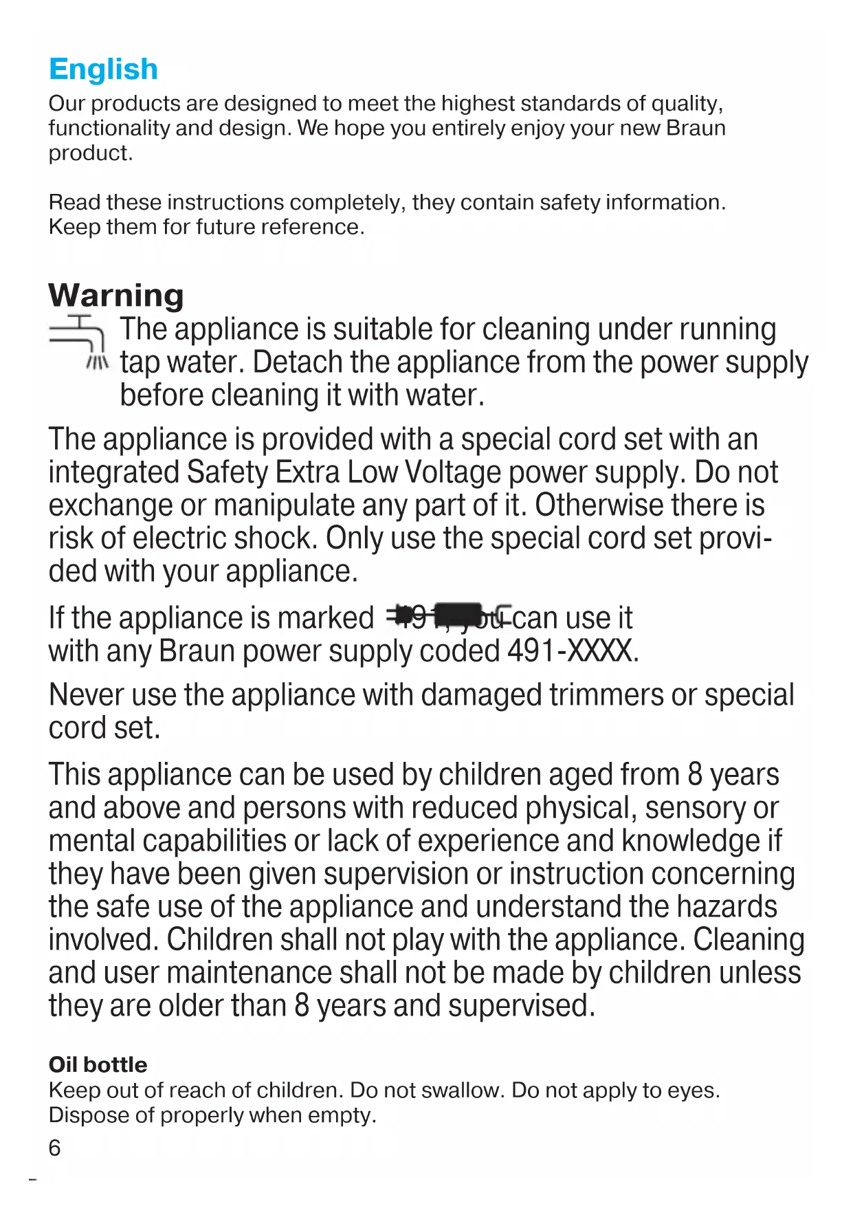 91063080_BT_5090-5010_CEEMEA_S5.indd 191063080_BT_5090-5010_CEEMEA_S5.indd 1 11.07.16 10:1311.07.16 10:13 CSS APPROVED Effective Date 5Aug2016 GMT - Printed 27Sep2016 Page 4 of 916 Our products are designed to meet the highest standards of quality, functionality and design. We hope you entirely enjoy your new Braun product. Read these instructions completely, they contain safety information. Keep them for future reference. Warning The appliance is suitable for cleaning under running tap water. Detach the appliance from the power supply before cleaning it with water. The appliance is provided with a special cord set with an integrated Safety Extra Low Voltage power supply. Do not exchange or manipulate any part of it. Otherwise there is risk of electric shock. Only use the special cord set provi- ded with your appliance. If the appliance is marked 491, you can use it with any Braun power supply coded 491-XXXX. Never use the appliance with damaged trimmers or special cord set. This appliance can be used by children aged from 8 years and above and persons with reduced physical, sensory or mental capabilities or lack of experience and knowledge if they have been given supervision or instruction concerning the safe use of the appliance and understand the hazards involved. Children shall not play with the appliance. Cleaning and user maintenance shall not be made by children unless they are older than 8 years and supervised. Oil bottle Keep out of reach of children. Do not swallow. Do not apply to eyes. Dispose of properly when empty. English 91063080_BT_5090-5010_CEEMEA_S6-92.indd 691063080_BT_5090-5010_CEEMEA_S6-92.indd 6 11.07.16 10:1311.07.16 10:13 CSS APPROVED Effective Date 5Aug2016 GMT - Printed 27Sep2016 Page 5 of 917 Description 1a Precision comb for trimming beard and short hair 1b Hair comb for cutting hair * 1c Release buttons for comb 2 Wide trimmer (32 mm) 3 Precision trimmer (16 mm) * 4 Release button precision trimmer * 5 Charge Indicator 6a Lock switch for precision comb 6b Length selector for precision comb 6c Length selector for hair comb 7 On/off switch 8 Special cord set (design can differ) 8a Charging stand * 9 Pouch *