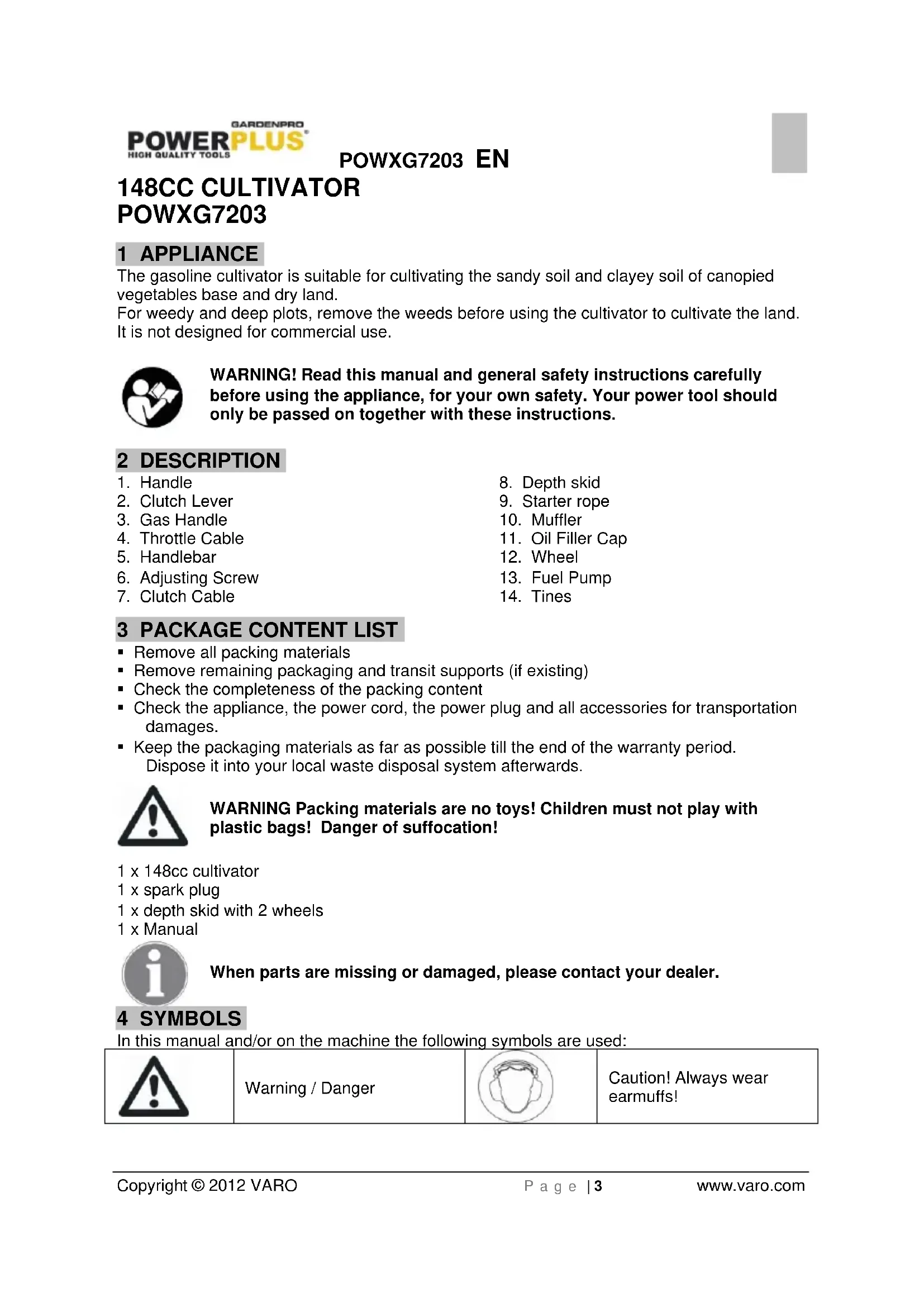 Copyright © 2012 VARO P a g e | 3 www.varo.com 148CC CULTIVATOR POWXG7203 1 APPLIANCE The gasoline cultivator is suitable for cultivating the sandy soil and clayey soil of canopied vegetables base and dry land. For weedy and deep plots, remove the weeds before using the cultivator to cultivate the land. It is not designed for commercial use. WARNING! Read this manual and general safety instructions carefully before using the appliance, for your own safety. Your power tool should only be passed on together with these instructions. 2 DESCRIPTION