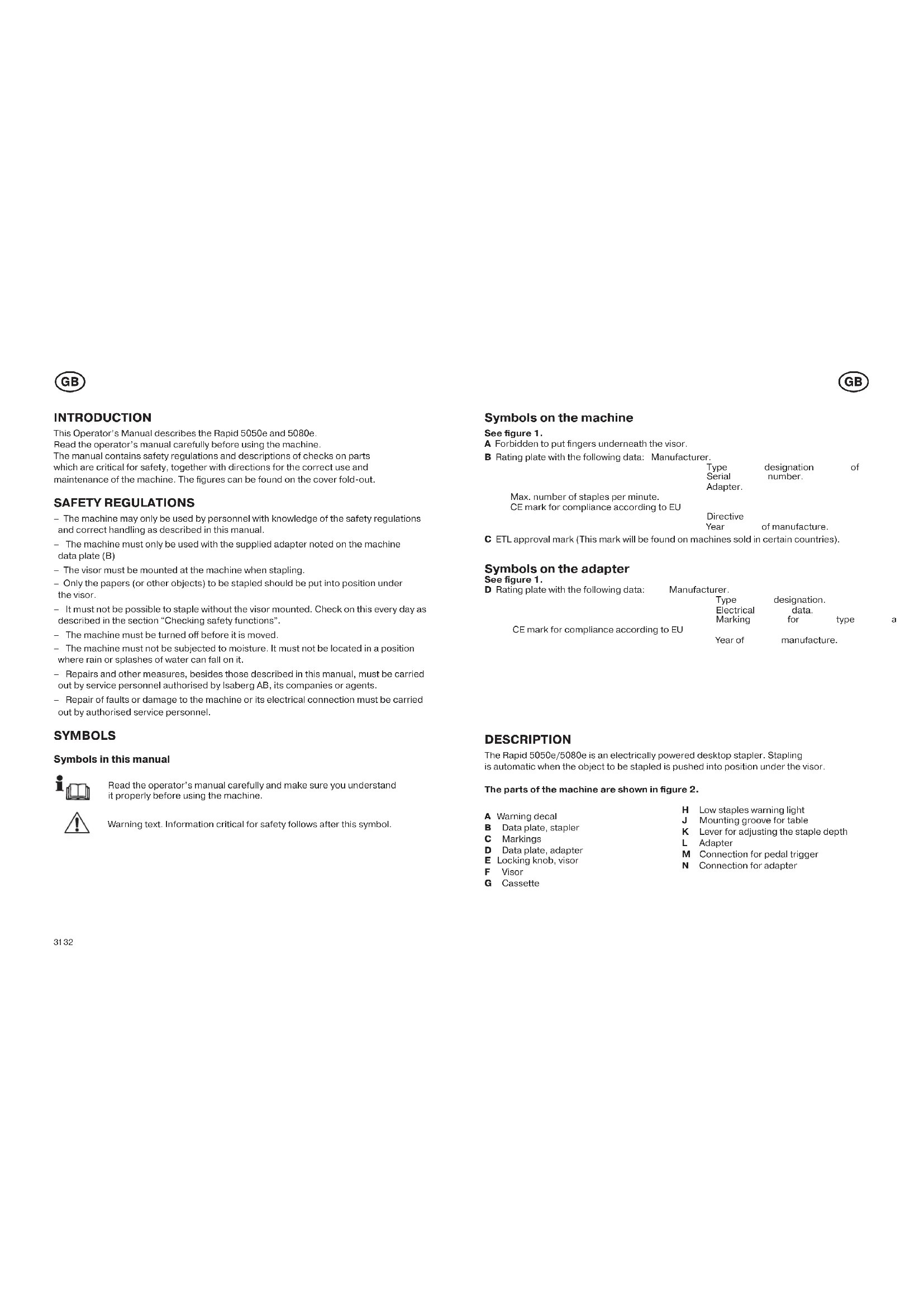 4894_pg_manual_5050e_5080e_v3.indd 29-30 14.10.13 11:4731 32 INTRODUCTION This Operator’s Manual describes the Rapid 5050e and 5080e. Read the operator’s manual carefully before using the machine. The manual contains safety regulations and descriptions of checks on parts which are critical for safety, together with directions for the correct use and maintenance of the machine. The figures can be found on the cover fold-out. SAFETY REGULATIONS – The machine may only be used by personnel with knowledge of the safety regulations and correct handling as described in this manual. – The machine must only be used with the supplied adapter noted on the machine data plate (B) – The visor must be mounted at the machine when stapling. – Only the papers (or other objects) to be stapled should be put into position under the visor. – It must not be possible to staple without the visor mounted. Check on this every day as described in the section “Checking safety functions”. – The machine must be turned off before it is moved. – The machine must not be subjected to moisture. It must not be located in a position where rain or splashes of water can fall on it. – Repairs and other measures, besides those described in this manual, must be carried out by service personnel authorised by Isaberg AB, its companies or agents. – Repair of faults or damage to the machine or its electrical connection must be carried out by authorised service personnel. SYMBOLS Symbols in this manual Read the operator’s manual carefully and make sure you understand it properly before using the machine. Warning text. Information critical for safety follows after this symbol.