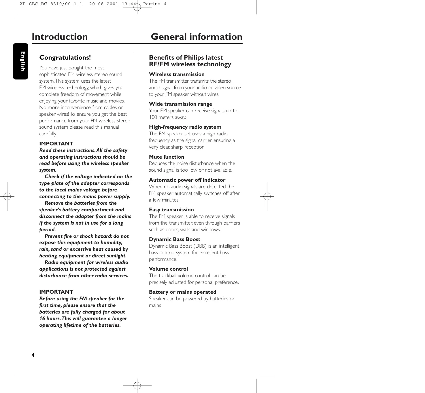 Benefits of Philips latest RF/FM wireless technology Wireless transmission The FM transmitter transmits the stereo audio signal from your audio or video source to your FM speaker without wires. Wide transmission range Your FM speaker can receive signals up to 100 meters away. High-frequency radio system The FM speaker set uses a high radio frequency as the signal carrier, ensuring a very clear, sharp reception. Mute function Reduces the noise disturbance when the sound signal is too low or not available. Automatic power off indicator When no audio signals are detected the FM speaker automatically switches off after a few minutes. Easy transmission The FM speaker is able to receive signals from the transmitter, even through barriers such as doors, walls and windows. Dynamic Bass Boost Dynamic Bass Boost (DBB) is an intelligent bass control system for excellent bass performance. Volume control The trackball volume control can be precisely adjusted for personal preference. Battery or mains operated Speaker can be powered by batteries or mains