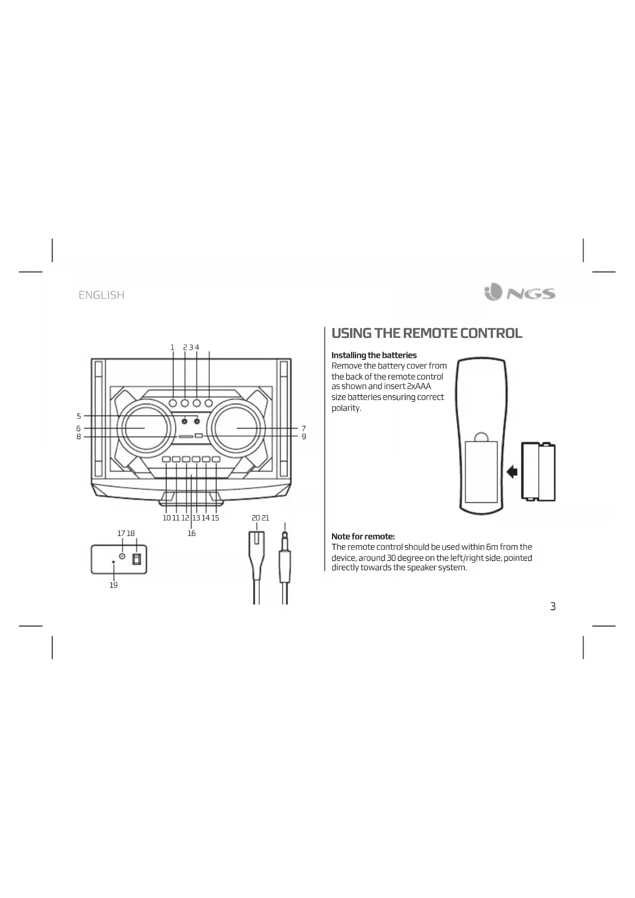 Installing the batteries Remove the battery cover from the back of the remote control as shown and insert 2xAAA size batteries ensuring correct polarity. Note for remote: The remote control should be used within 6m from the device, around 30 degree on the left/right side, pointed directly towards the speaker system.