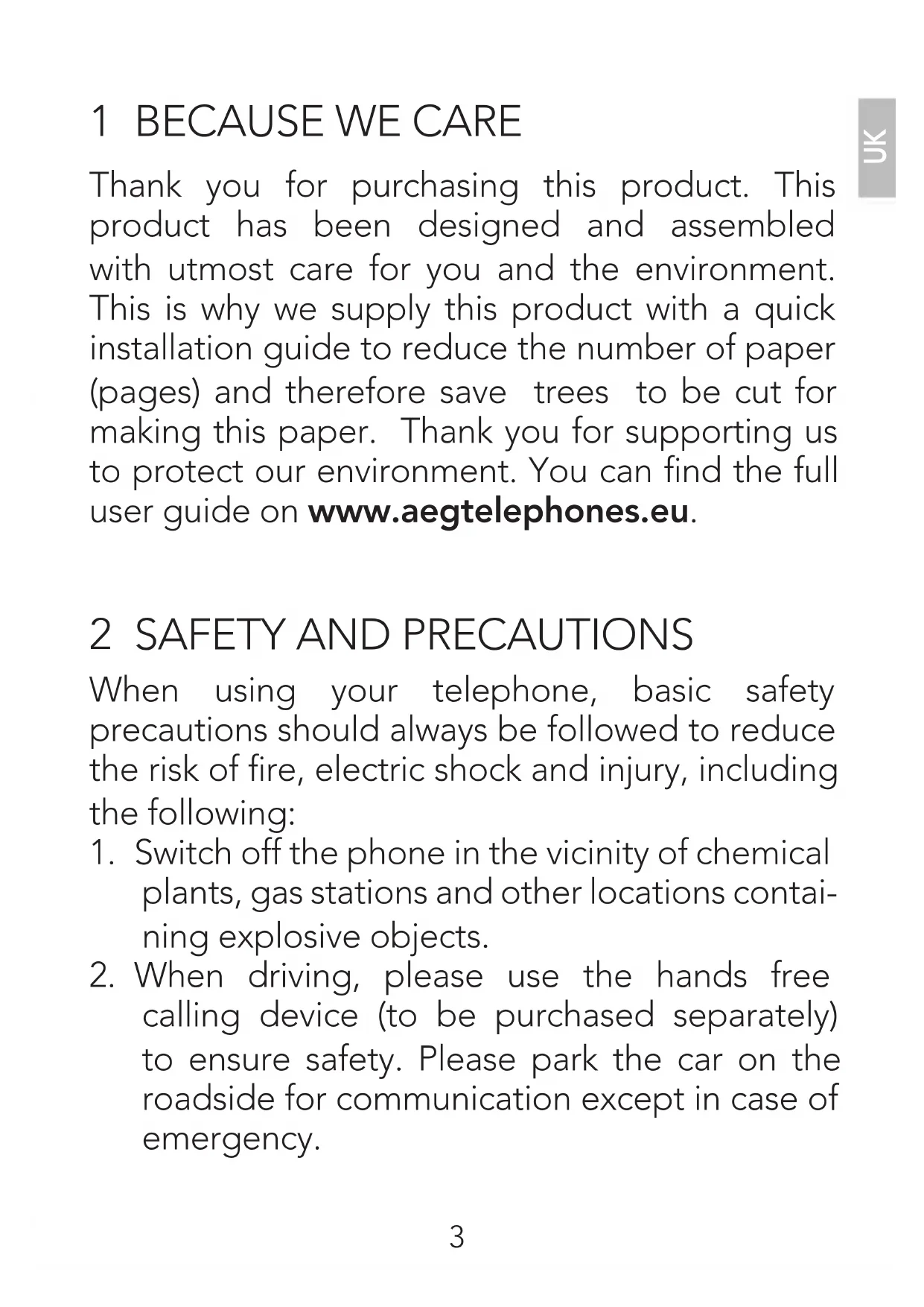 Thank you for purchasing this product. This product has been designed and assembled with utmost care for you and the environment. This is why we supply this product with a quick installation guide to reduce the number of paper (pages) and therefore save trees to be cut for making this paper. Thank you for supporting us to protect our environment. You can find the full user guide on www.aegtelephones.eu.