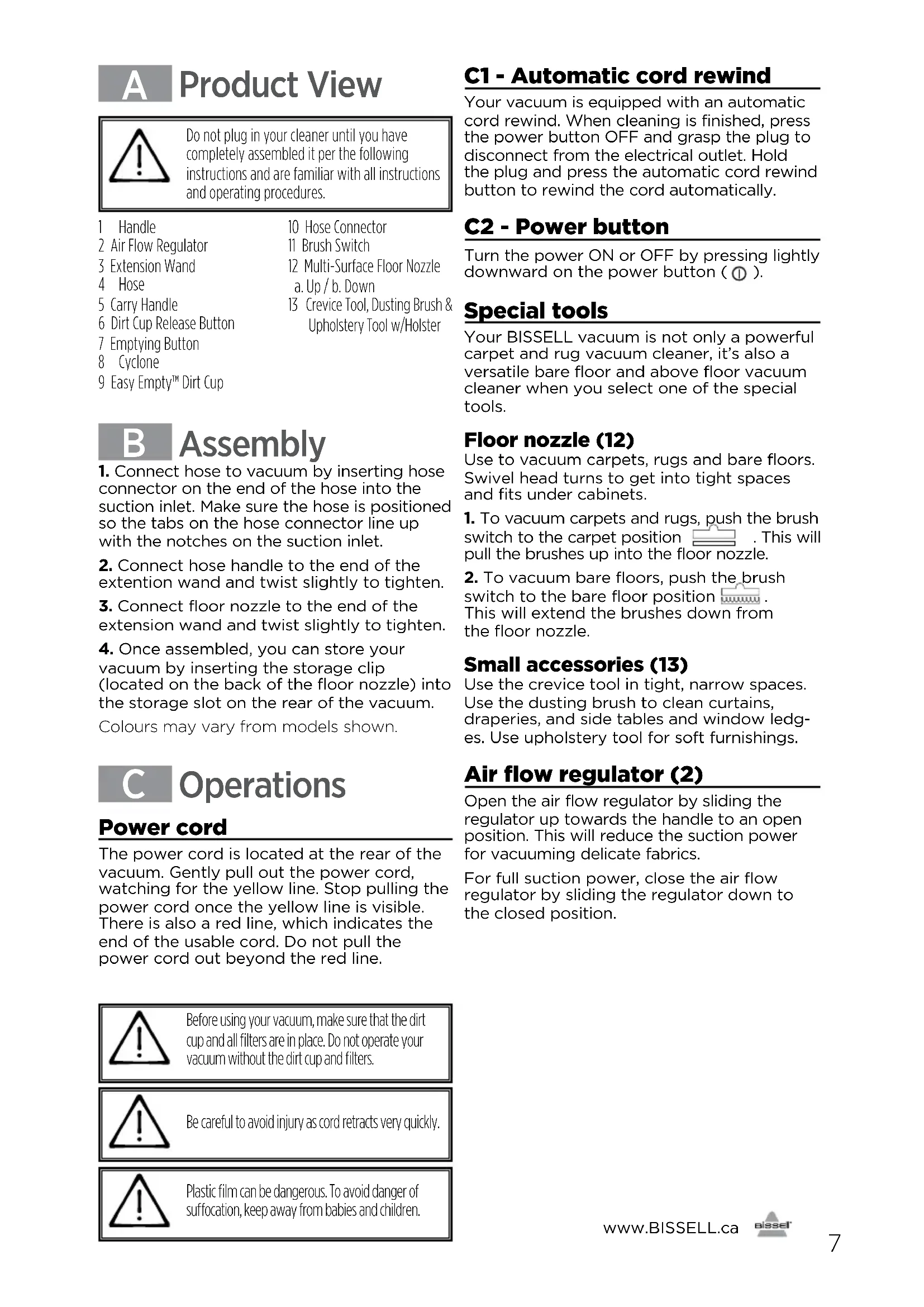 Operations Power cord The power cord is located at the rear of the vacuum. Gently pull out the power cord, watching for the yellow line. Stop pulling the power cord once the yellow line is visible. There is also a red line, which indicates the end of the usable cord. Do not pull the power cord out beyond the red line. Do not plug in your cleaner until you have completely assembled it per the following instructions and are familiar with all instructions and operating procedures.Be careful to avoid injury as cord retracts very quickly.Plastic film can be dangerous. To avoid danger of suocation, keep away from babies and children.Before using your vacuum, make sure that the dirt cup and all filters are in place. Do not operate your vacuum without the dirt cup and filters.1 Handle2 Air Flow Regulator3 Extension Wand4 Hose5 Carry Handle6 Dirt Cup Release Button7 Emptying Button8 Cyclone9 Easy Empty™ Dirt Cup10 Hose Connector11 Brush Switch12 Multi-Surface Floor Nozzle a. Up / b. Down13 Crevice Tool, Dusting Brush & Upholstery Tool w/Holster8