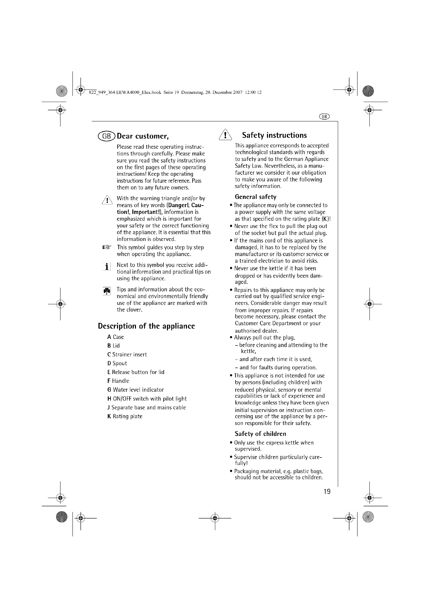 - Never use the flex to pull the plug out of the socket but pull the actual plug.• If the mains cord of this appliance is damaged, it has to be replaced by the manufacturer or its customer service or a trained electrician to avoid risks.• Never use the kettle if it has been dropped or has evidently been dam-aged.• Repairs to this appliance may only be carried out by qualified service engi-neers. Considerable danger may result from improper repairs. If repairs become necessary, please contact the Customer Care Department or your authorised dealer.• Always pull out the plug,– before cleaning and attending to the kettle,– and after each time it is used,– and for faults during operation.• This appliance is not intended for use by persons (including children) with reduced physical, sensory or mental capabilities or lack of experience and knowledge unless they have been given initial supervision or instruction con-cerning use of the appliance by a per-son responsible for their safety.Safety of children• Only use the express kettle when supervised.• Supervise children particularly care-fully!• Packaging material, e.g. plastic bags, should not be accessible to children.822_949_364 EEWA4000_Elux.book Seite 19 Donnerstag, 20. Dezember 2007 12:00 12g