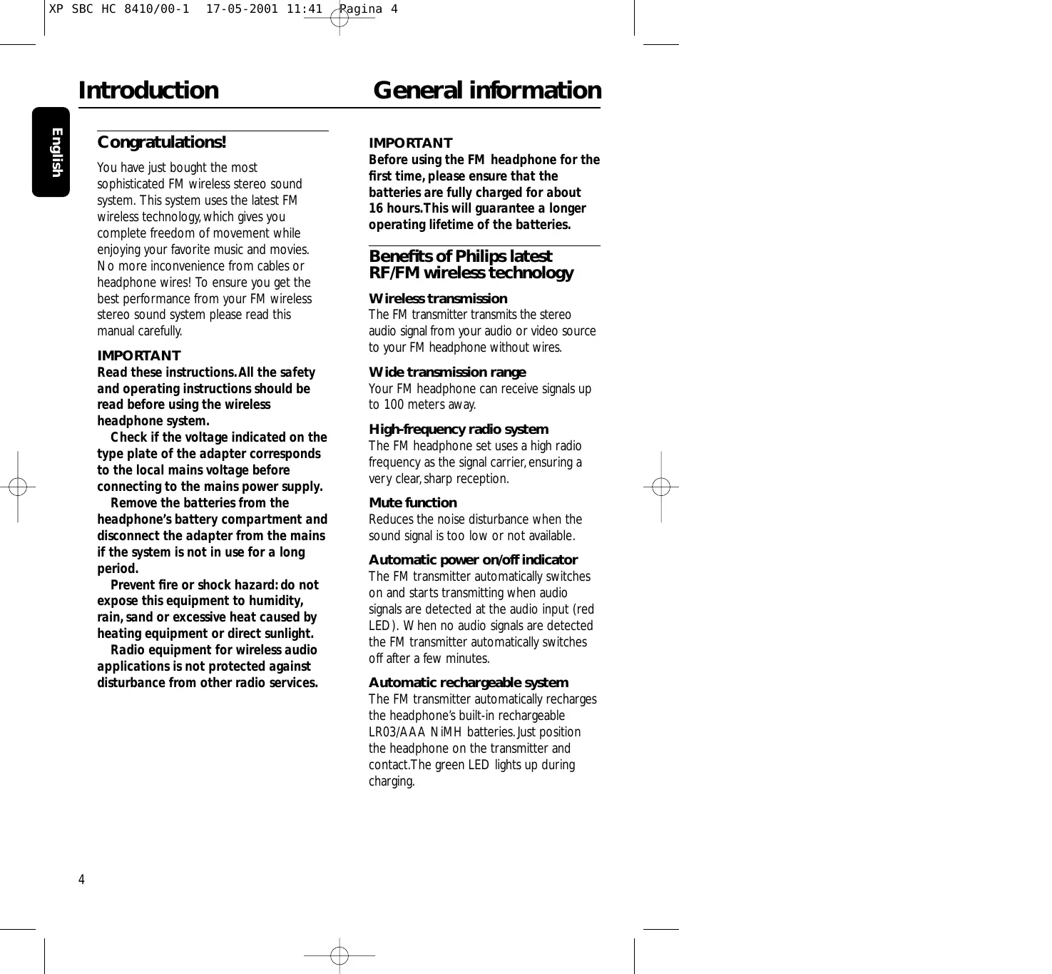 Pagina 4 General information IMPORTANT Before using the FM headphone for the first time, please ensure that the batteries are fully charged for about 16 hours.This will guarantee a longer operating lifetime of the batteries. Benefits of Philips latest RF/FM wireless technology Wireless transmission The FM transmitter transmits the stereo audio signal from your audio or video source to your FM headphone without wires. Wide transmission range Your FM headphone can receive signals up to 100 meters away. High-frequency radio system The FM headphone set uses a high radio frequency as the signal carrier, ensuring a very clear, sharp reception. Mute function Reduces the noise disturbance when the sound signal is too low or not available. Automatic power on/off indicator The FM transmitter automatically switches on and starts transmitting when audio signals are detected at the audio input (red LED). When no audio signals are detected the FM transmitter automatically switches off after a few minutes. Automatic rechargeable system The FM transmitter automatically recharges the headphone’s built-in rechargeable LR03/AAA NiMH batteries. Just position the headphone on the transmitter and contact.The green LED lights up during charging. 17-05-2001 11:41 Pagina 5 General information Easy transmission The FM headphone is able to receive signals from the transmitter, even through barriers such as doors, walls and windows. Multiple headphones with one transmitter An additional number of headphones and/or wireless speakers can be used with a single transmitter if they: - operate in the 864 MHz band - can detect a 19 kHz pilot tone Please consult the appliance’s electrical specification sheets for confirmation on compatibility. Controls English