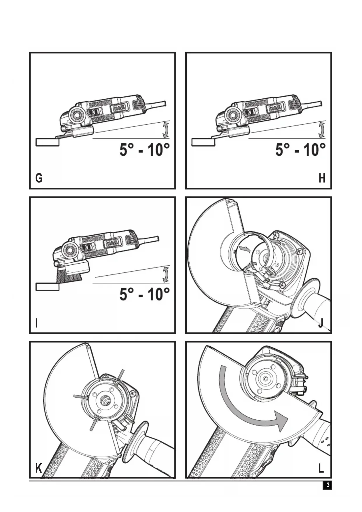 I J K L4 ENGLISH (Original instructions) Intended use Your BLACK+DECKER BEG110, BEG120, BEG210 and BEG220 angle grinders have been designed for grinding and cutting metal and masonry using the appropriate type of cutting or grinding disc. When tted with the appropriate guard, These tools are intended for consumer use only. Safety instructions General power tool safety warnings