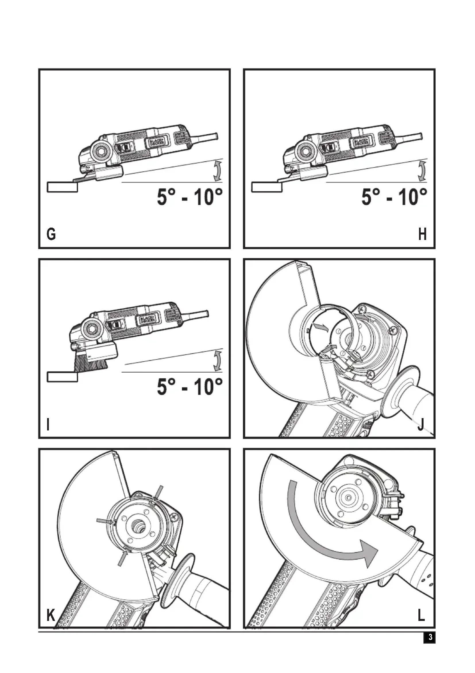 I J K L4 ENGLISH (Original instructions) Intended use Your BLACK+DECKER BEG110, BEG120, BEG210 and BEG220 angle grinders have been designed for grinding and cutting metal and masonry using the appropriate type of cutting or grinding disc. When tted with the appropriate guard, These tools are intended for consumer use only. Safety instructions General power tool safety warnings