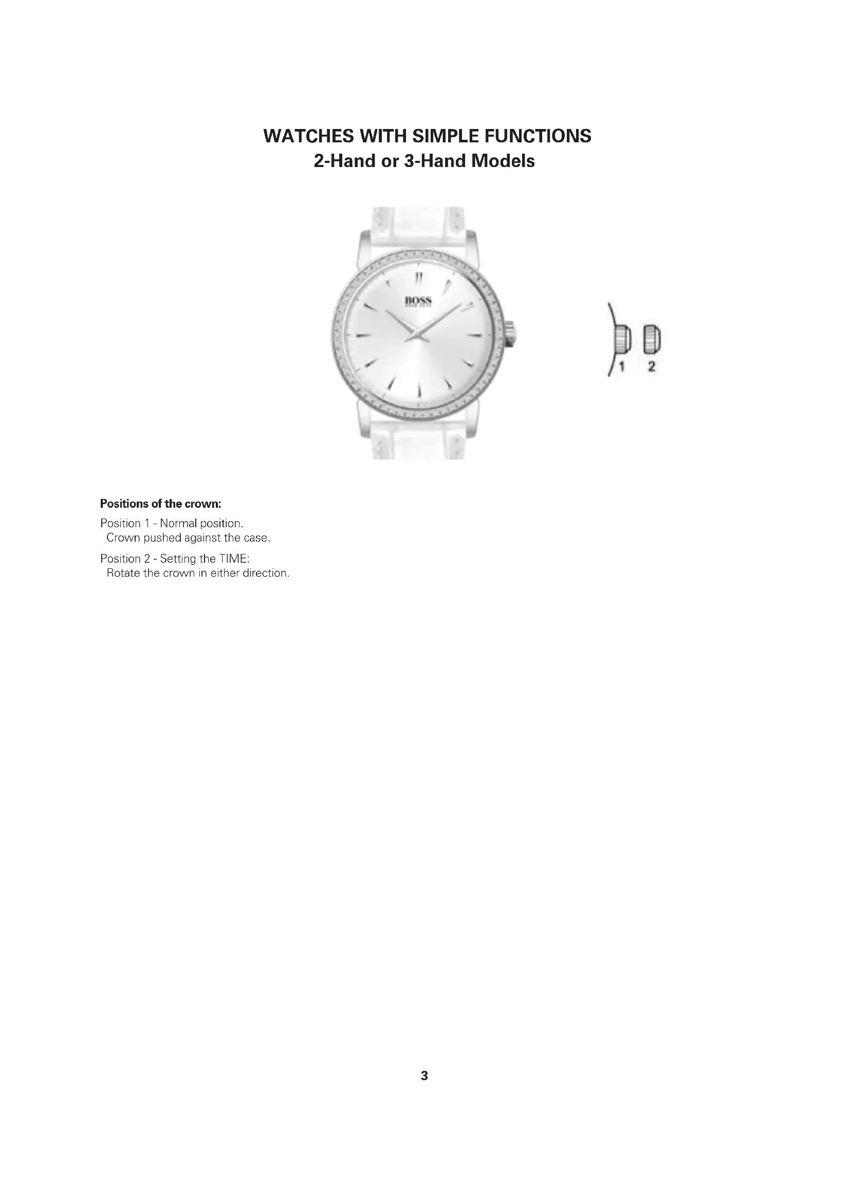 2-Hand or 3-Hand Models Positions of the crown: Position 1 - Normal position. Crown pushed against the case. Position 2 - Setting the TIME: Rotate the crown in either direction.4