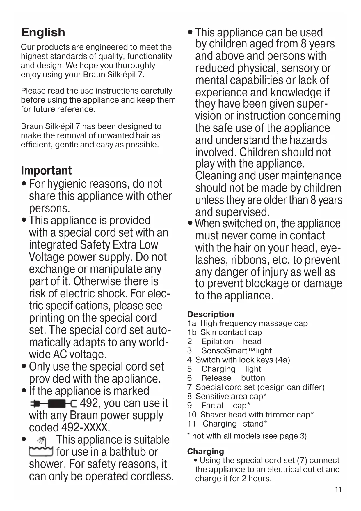 - Using the special cord set (7) connect the appliance to an electrical outlet and charge it for 2 hours. 91392805_SES_7_890_880_870_860_700_JUNO_S6-124.indd 1191392805_SES_7_890_880_870_860_700_JUNO_S6-124.indd 11 06.06.17 11:1006.06.17 11:10 CSS APPROVED Effective Date 6Jun2017 GMT - Printed 30Aug2017 Page 11 of 12412 Charging light (5) Flashing green: charging Green: fully charged Yellow: 15 min charge left Flashing yellow: 5 min charge left